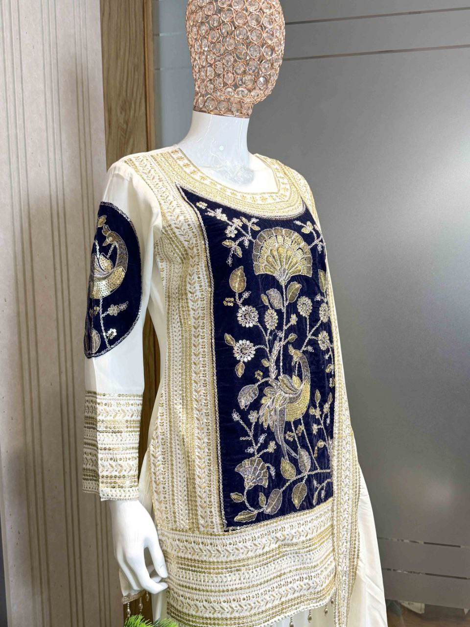 Celebrate Eid in timeless elegance with our Off-White Dhurandhar Kurta Palazzo Set, designed especially for festive and bridal occasions. Crafted using luxurious French Crepe and rich velvet detailing, this ensemble features exquisite sequins embroidery that adds a regal charm. The soothing off-white shade paired with premium fabric quality makes it a perfect pick for Eid gatherings, wedding functions, and special celebrations.