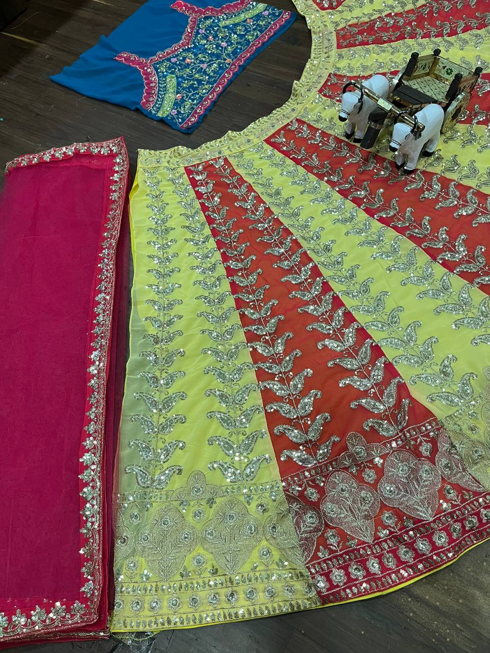 Step into the spotlight with this 3.5 Meter Flared Fox Georgette Lehenga, a perfect blend of luxury, comfort, and craftsmanship. Designed to make every twirl mesmerizing, this lehenga features rich sequins embroidery, enhanced with can-can and canvas layers for a voluminous royal look.