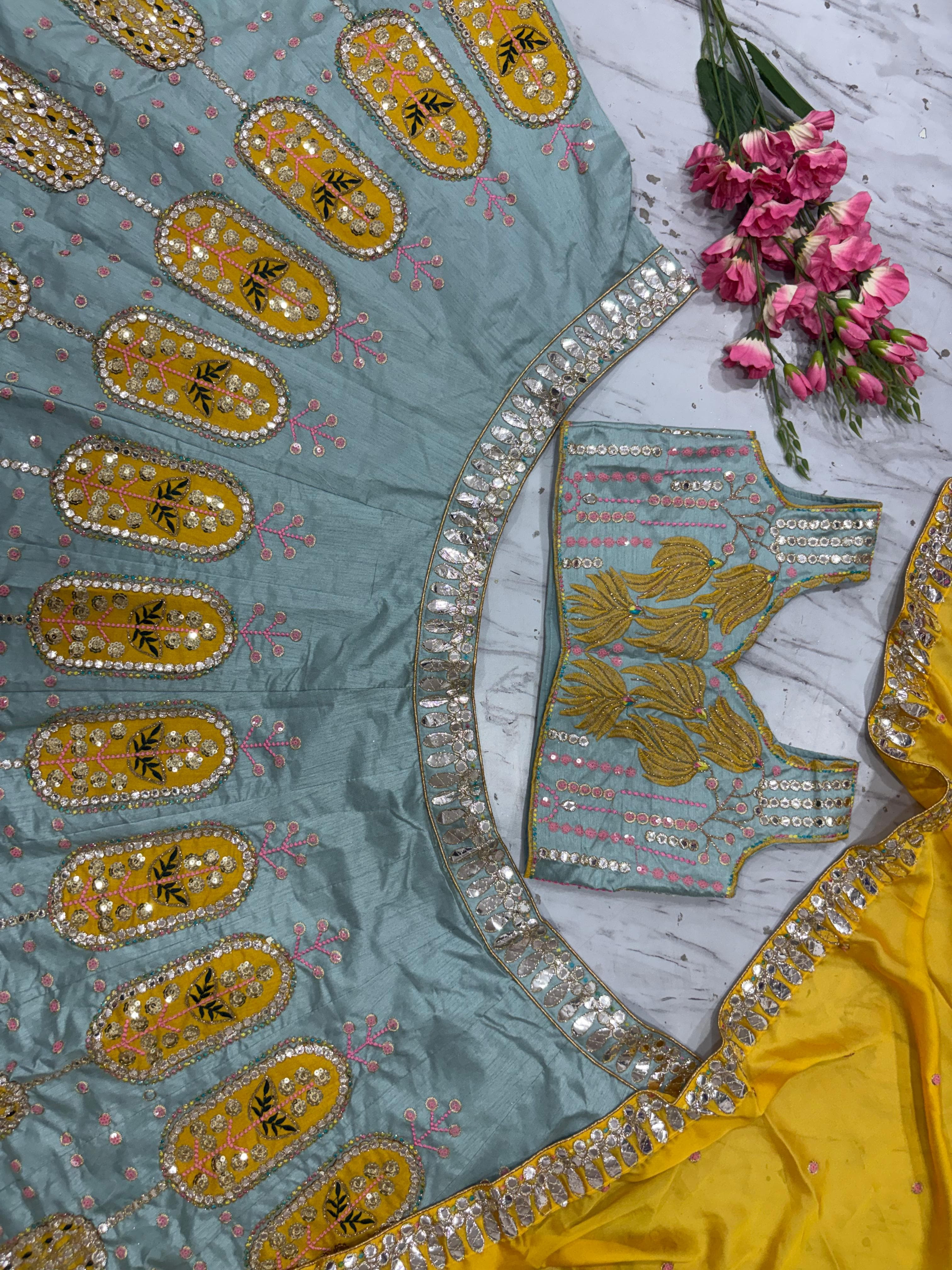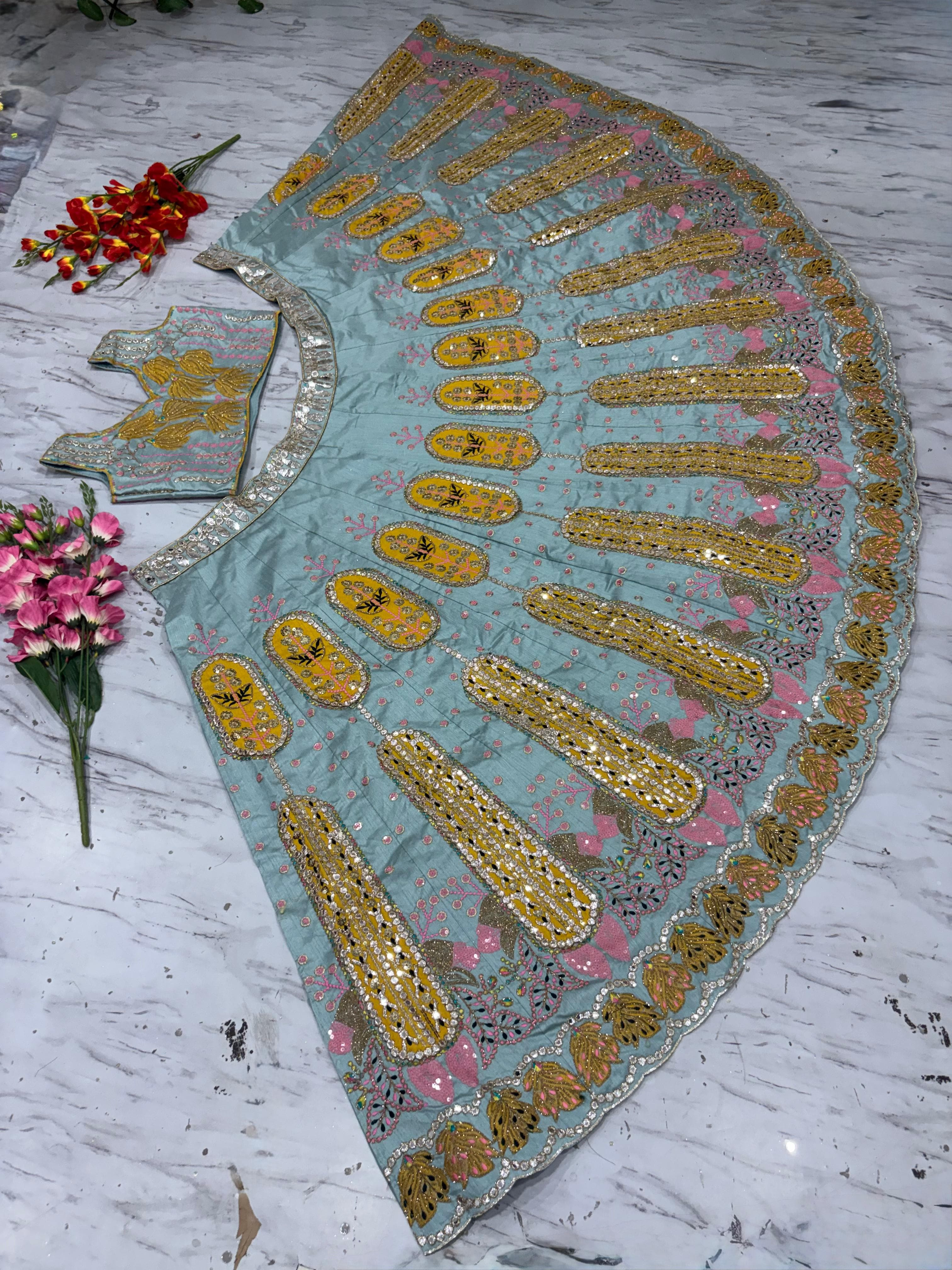 Dazzle and delight in our exquisite 3.5 Mtr Flared Real Mirror Work Lehenga Choli. This stunning ensemble is designed to make you the center of attention at any special occasion. The generous 3.5-meter flair of the lehenga ensures a majestic silhouette, creating graceful movement with every step. Intricately handcrafted with genuine mirror work, each piece reflects light beautifully, adding a touch of ethereal sparkle that is sure to captivate. The rich fabric drapes elegantly, promising both comfort and a luxurious feel against your skin, making it perfect for weddings, festive celebrations, and grand parties.