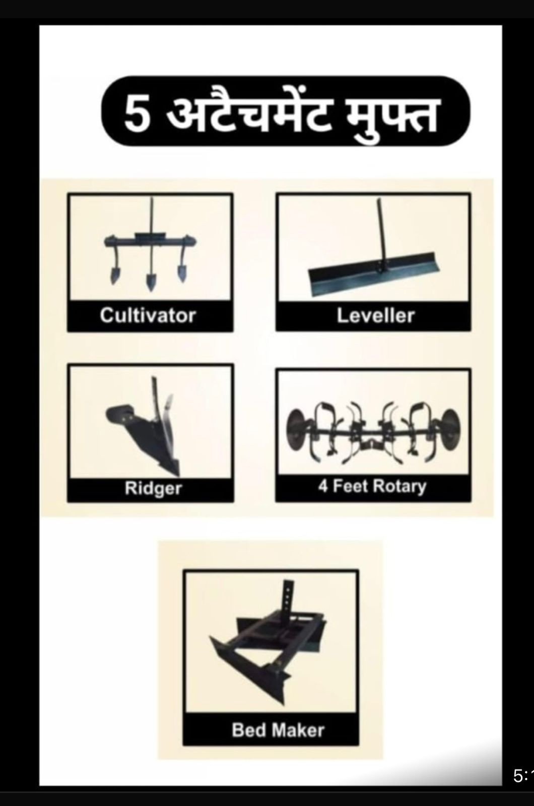 • Attachment: Cultivator, Leveller, Ridger, 4 Feet Rotary, Bed Maker