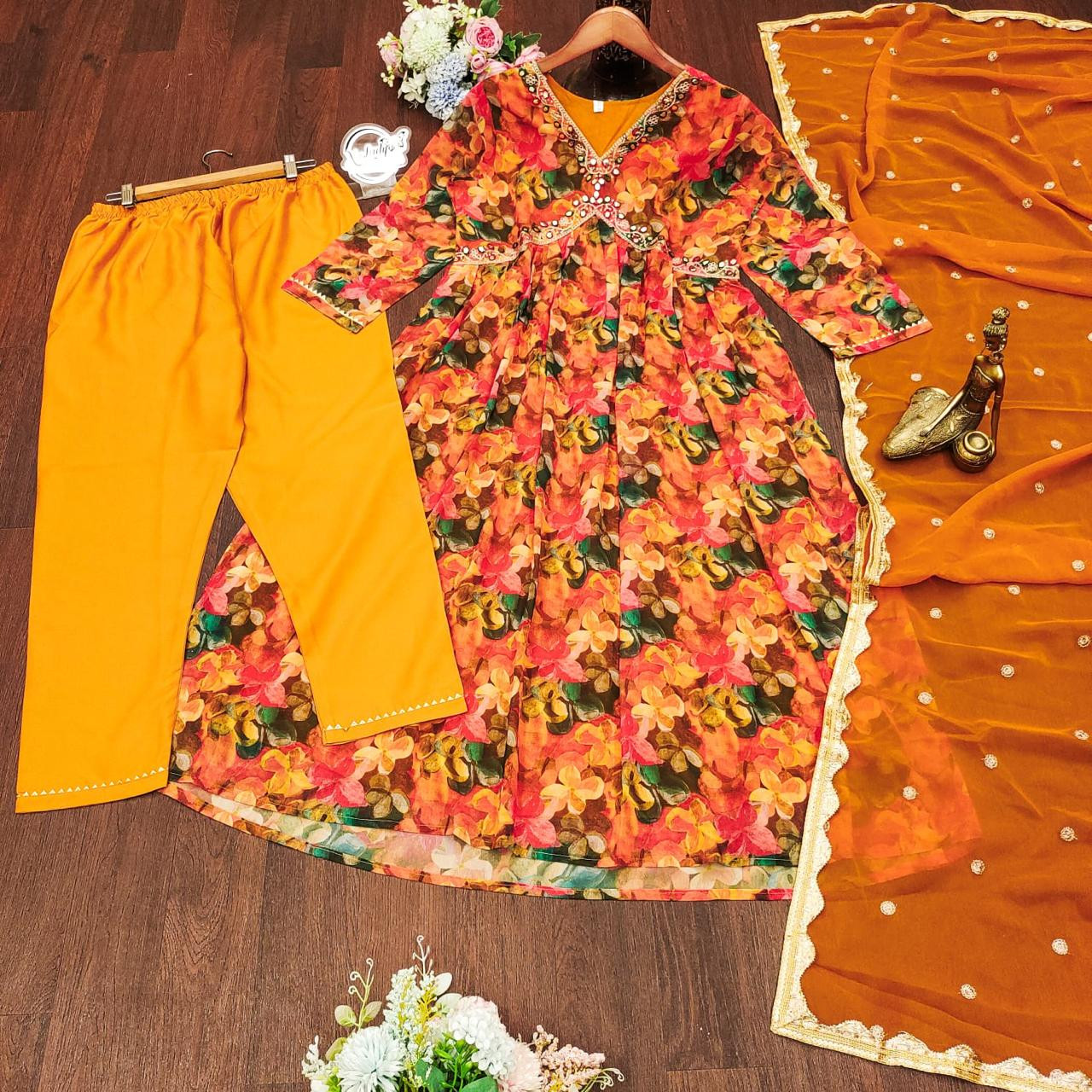 Fabric Fox Georgette with digital print gown With mirror work frill with mirror work Dupptta with print pent
