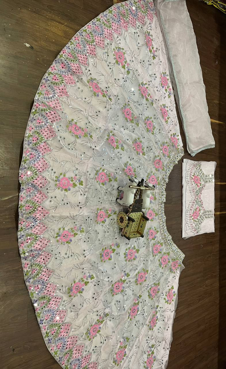 Step into elegance with our Beautiful Real Mirror Work Lehenga, crafted from premium Heavy Organza Silk for a luxurious yet comfortable drape. This exquisite ensemble showcases real mirror embroidery with sequin detailing, exuding timeless glamour and festive charm. Designed with Can-Can and Canvas layers, it provides a voluminous 3.5-meter flare that ensures you make a grand statement at every occasion.