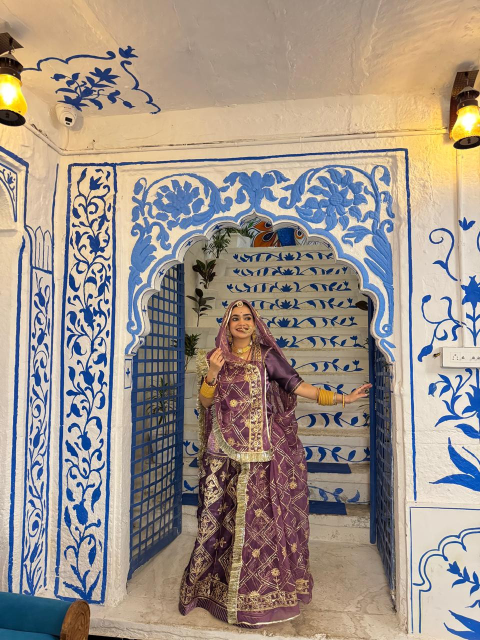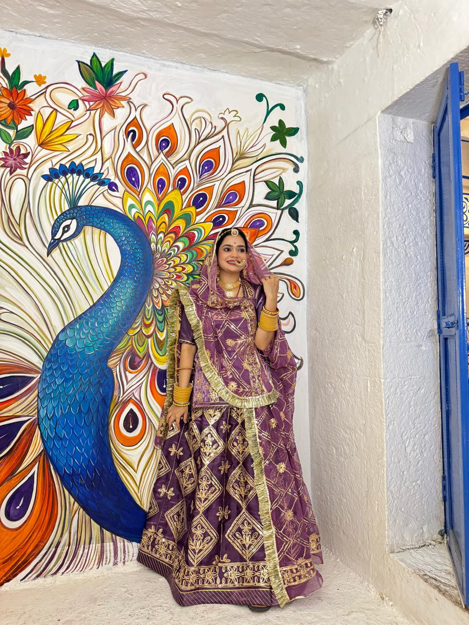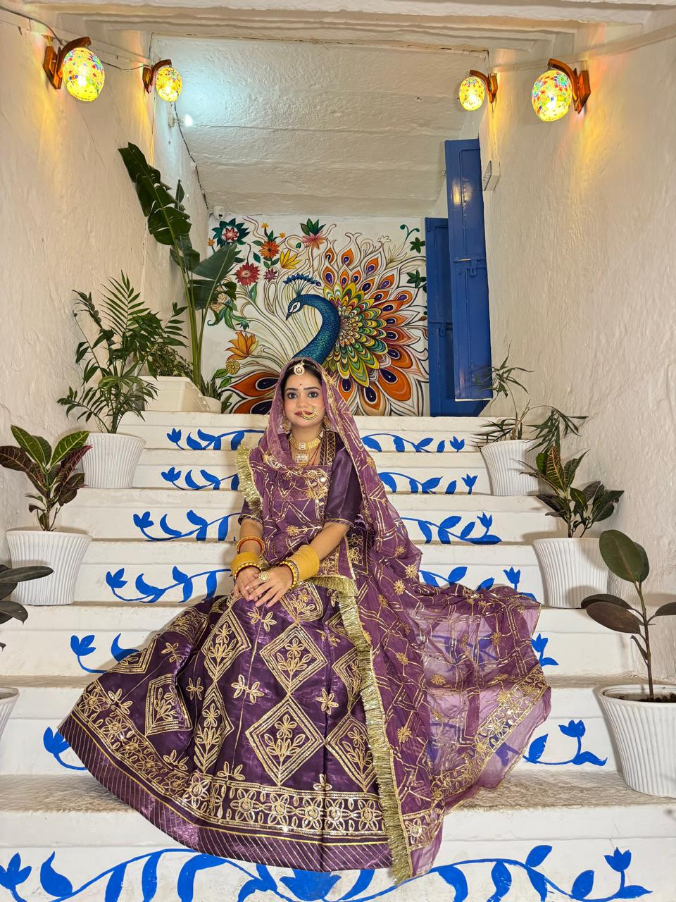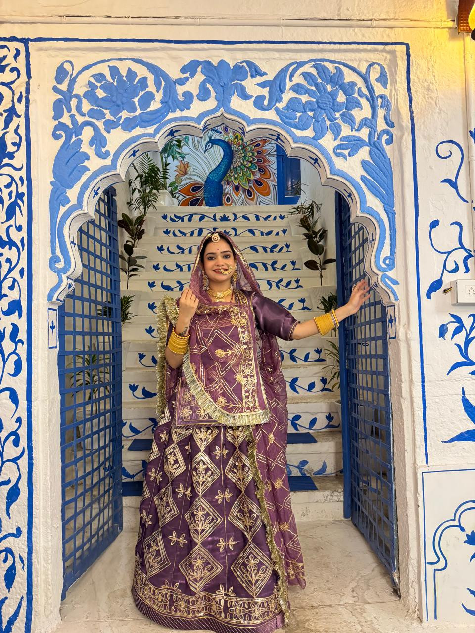 Elevate your royal charm with Bindani Brand Lavender Tissue Rajputi Poshak, crafted from high Jimmy Choo tissue fabric. Adorned with heavy fancy work and paired with premium Hamrahi pure odhna, featuring complete gota kiran for a truly regal look.