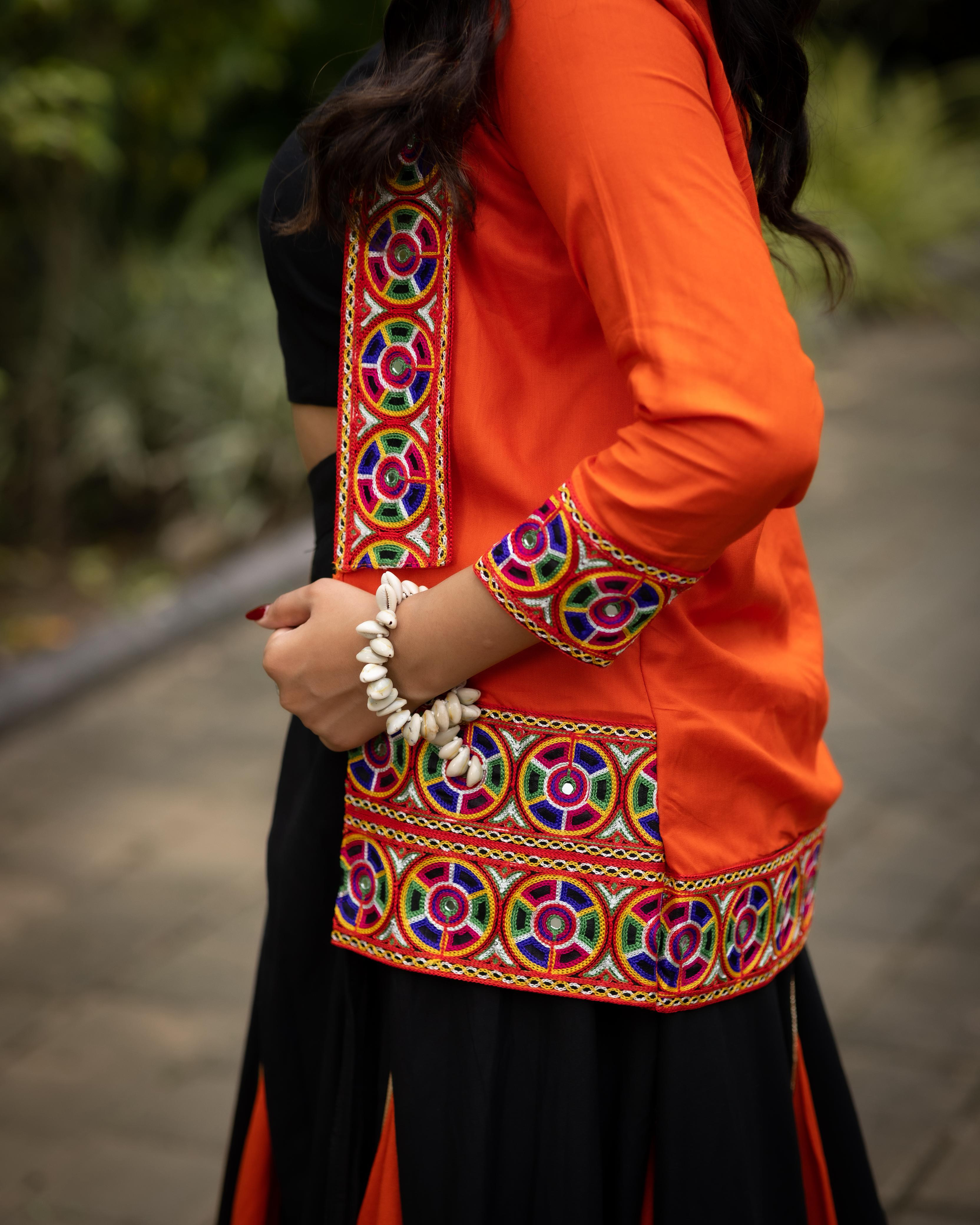 Flaunt ethnic elegance with this Fanta Orange Navratri choli set, A perfect pick for dandiya nights, this Navratri outfit is designed with multicolor panels and Kutchhi Work Fancy Koti Worked With Real mirrors.
