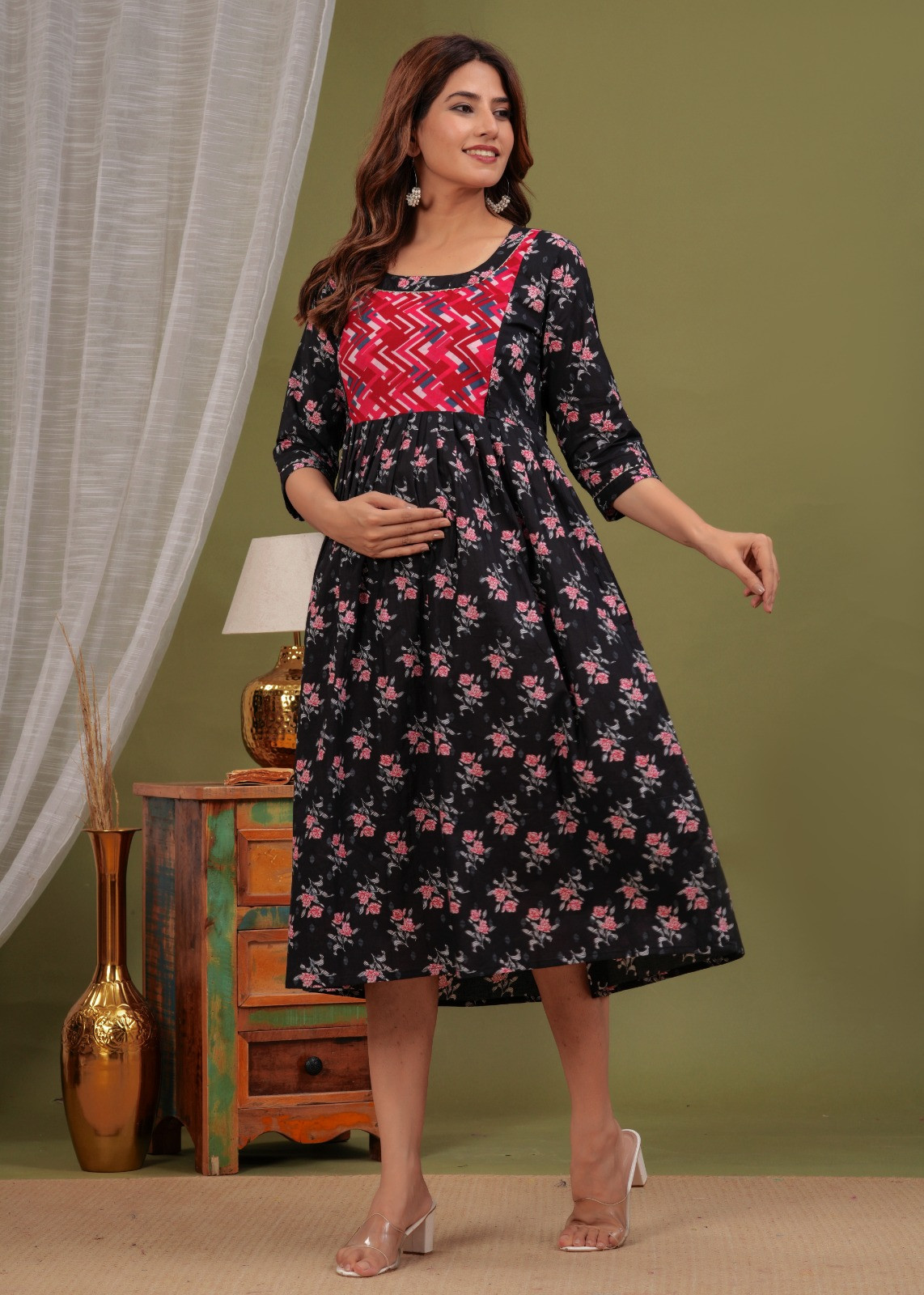 Bump-Friendly Design: Concealing Pleats Strategically placed center pleats around the tummy hide the baby bump with style.