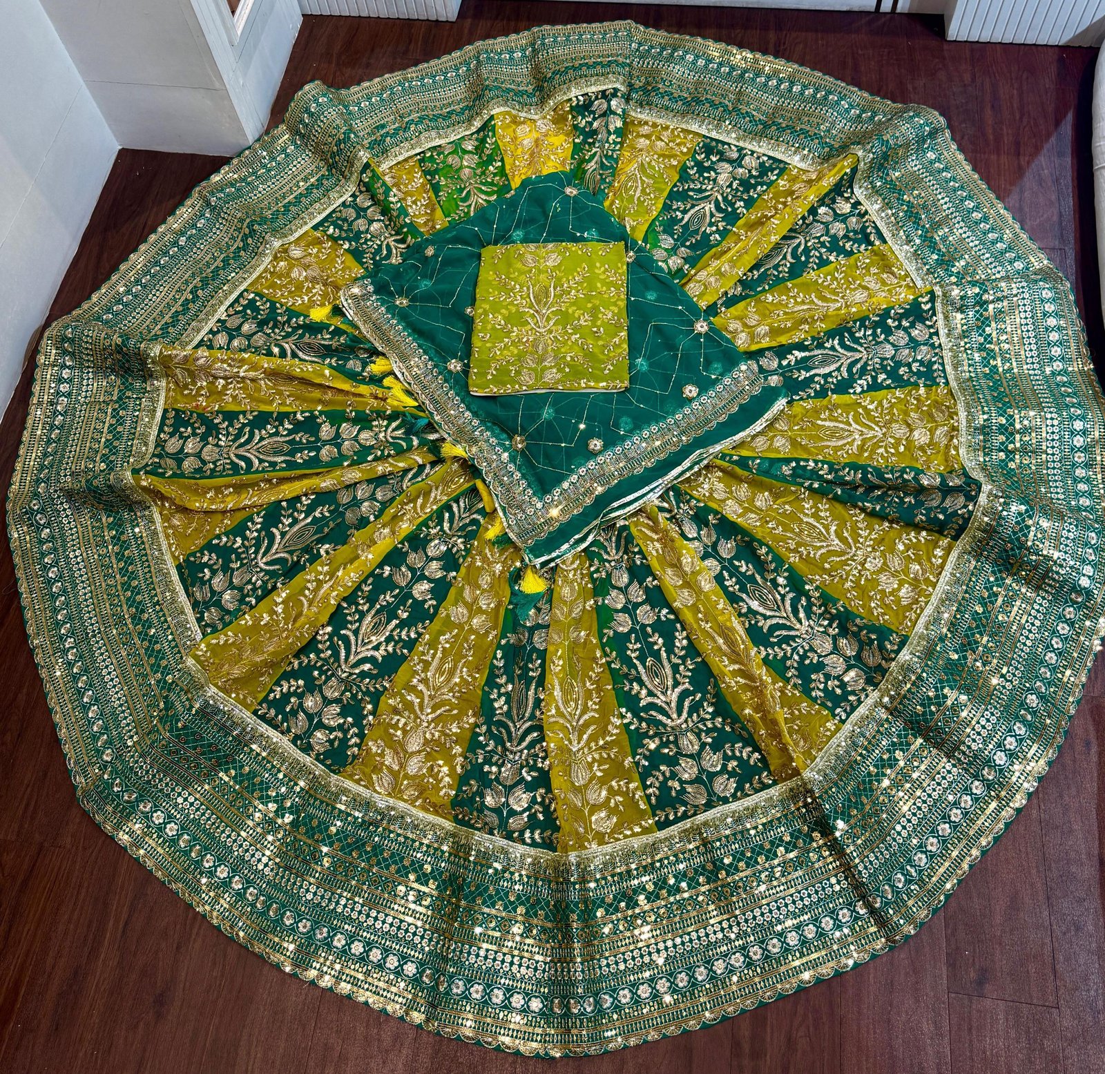 Unveil regal elegance with our Designer Heavy Boutique Poshak, featuring a grand 7-meter gher lehenga crafted from premium georgette fabric. This ensemble includes a 1.80-meter designer kurti with rich allover embroidery and a royal pure odhani adorned with Banarasi borders, vintage-style zari, and sequin detailing. The four-sided heavy odhani showcases intricate jaal work finished with gota turri. Perfect for weddings, royal events, and traditional celebrations, this poshak redefines timeless Rajputi style with luxurious finesse.