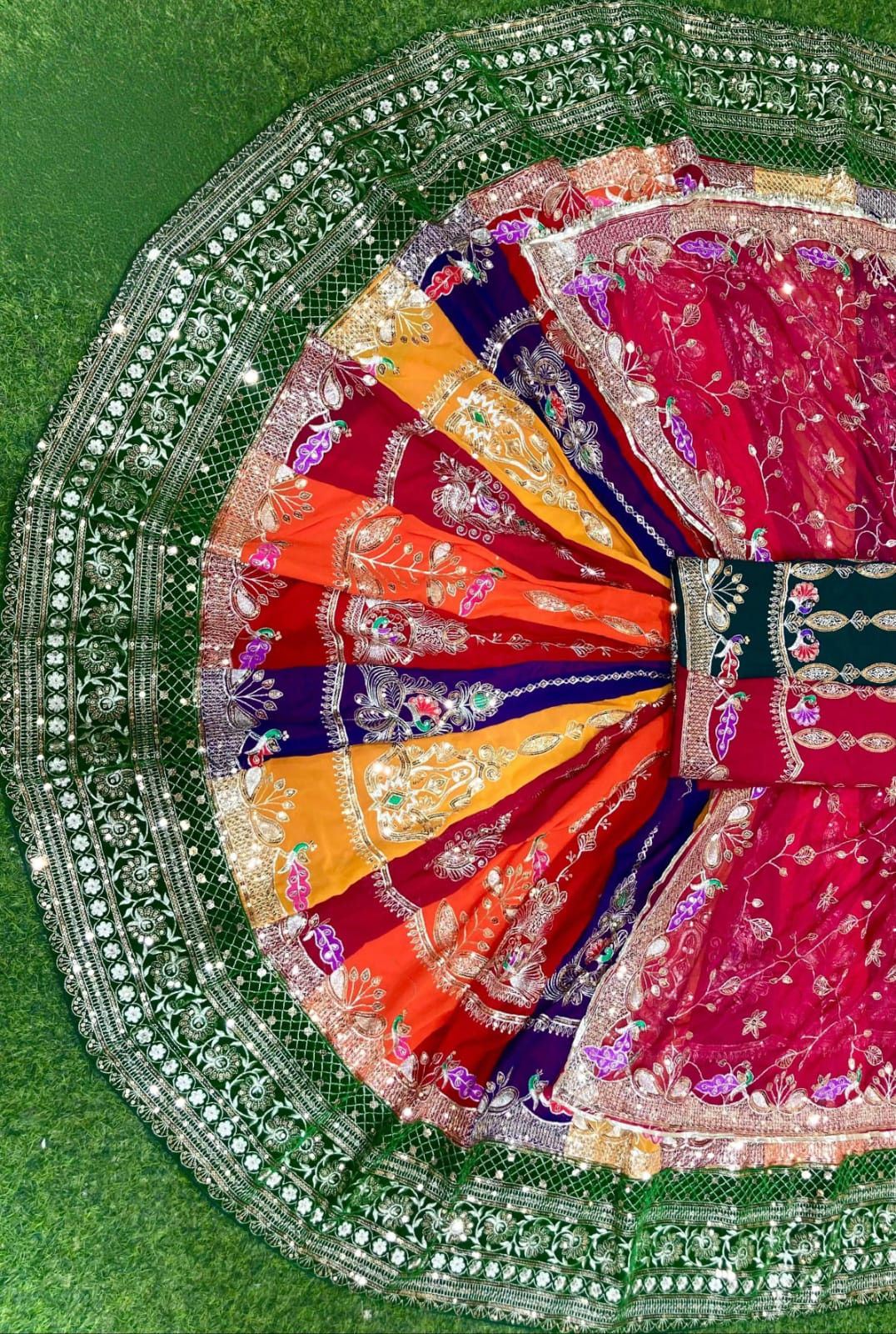 The lehenga is beautifully highlighted with a heavy velvet border, adorned with vintage-style zari and sequin work, offering an exquisite handcrafted look and flawless finishing. Designed with a 4 meter gher, it gives a graceful flare and majestic movement.