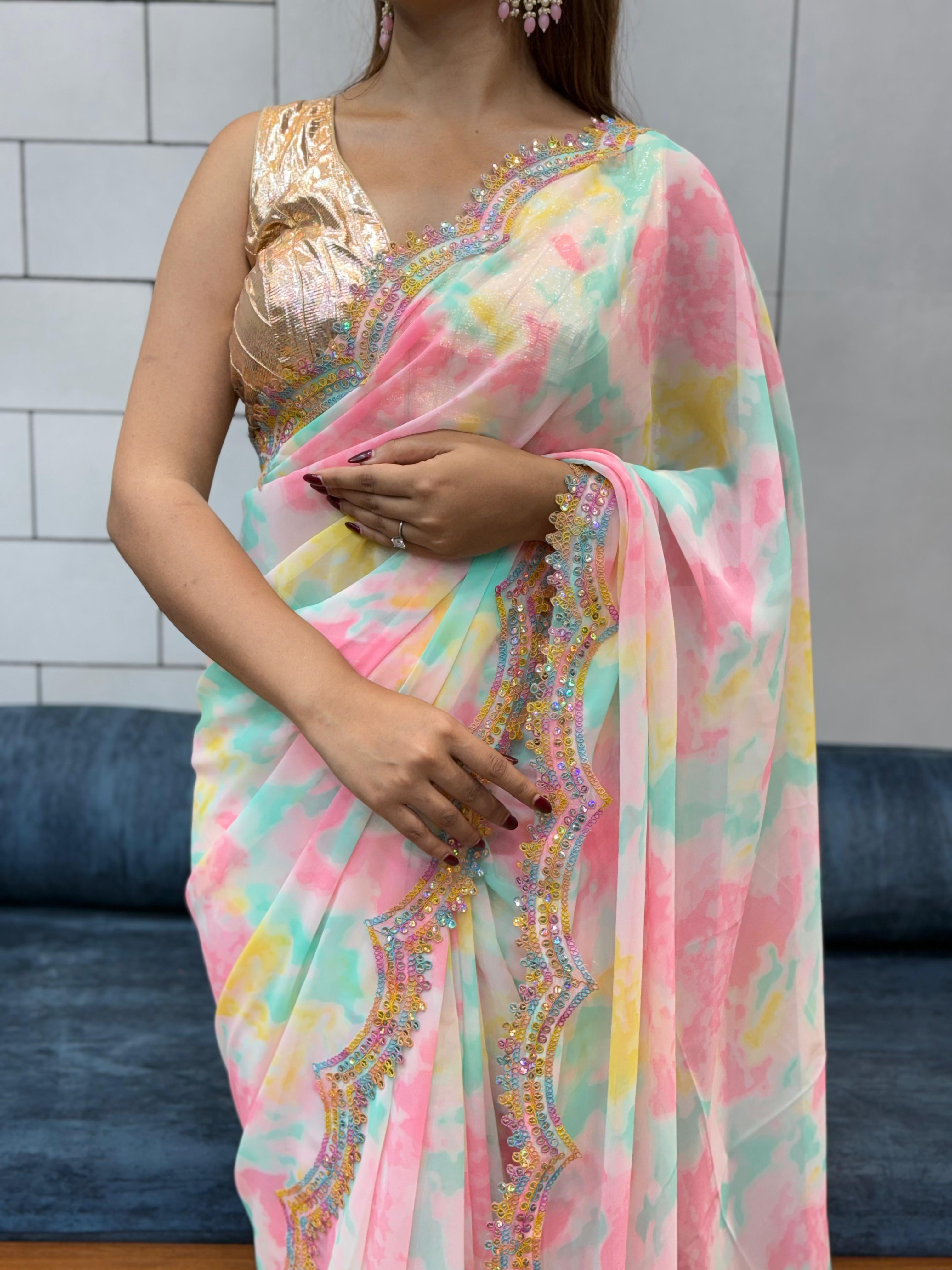 Celebrity Style Shibori Print Soft Faux Georgette Saree with Rainbow Lace