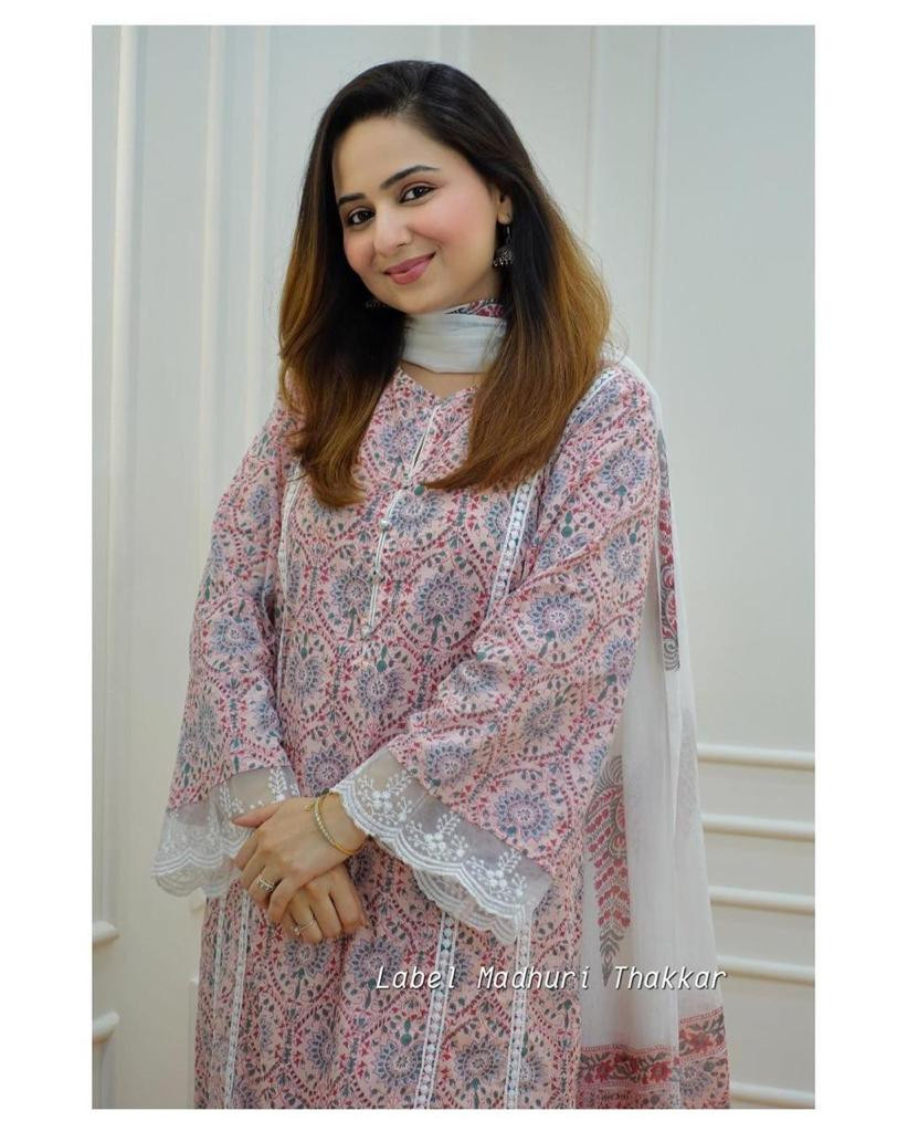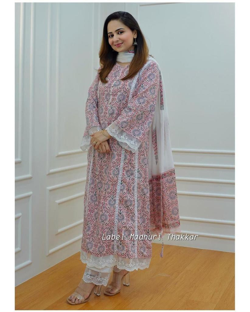 Featuring Beautiful Pakistani A line Cotton Suit which is has beautiful lace detailing and prints. It is very easy breezy and comfortable as it looks It is paired with matching lace pants and cotton Dupatta