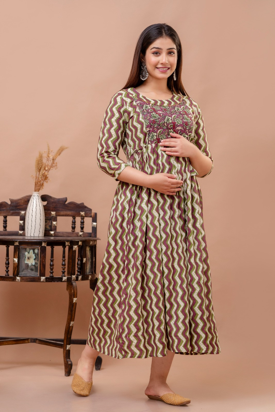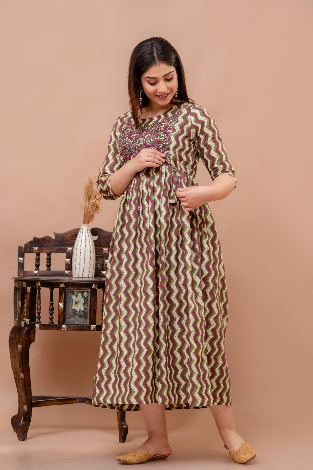 Latest Anarkali Gown Style Western Dress is lightweight, breathable, stretchy & incredibly soft to the skin and keeps you cool all day long. The Feeding top has been designed uniquely plats around tummy area to hide Pre and Post Pregnancy baby bump beautifully.