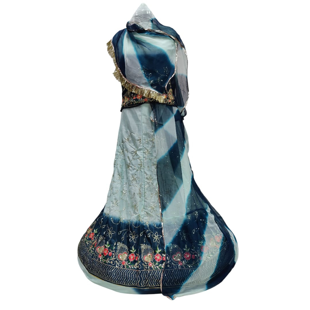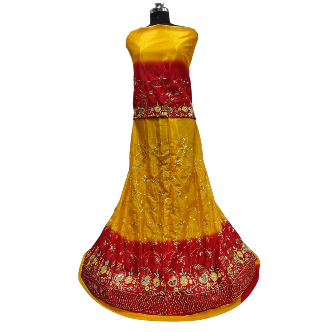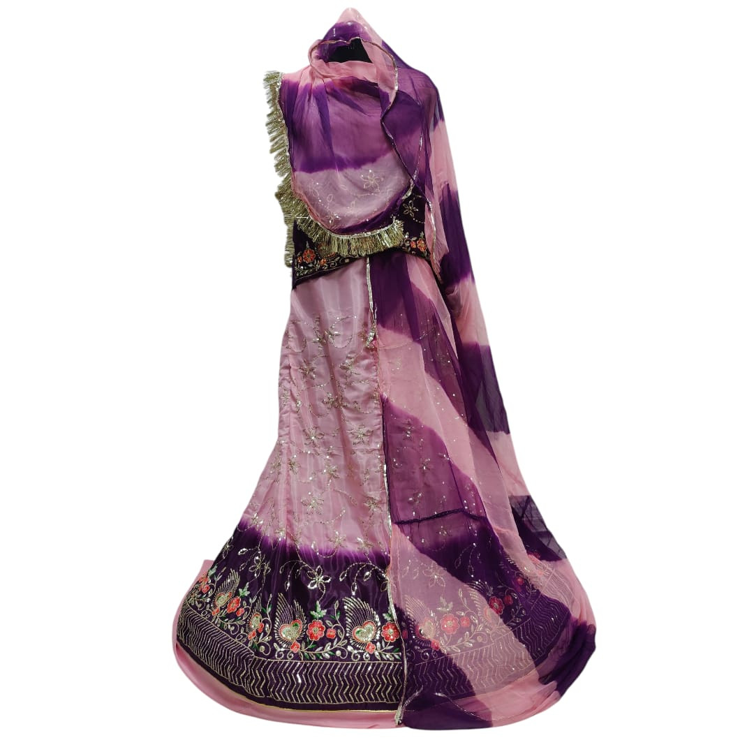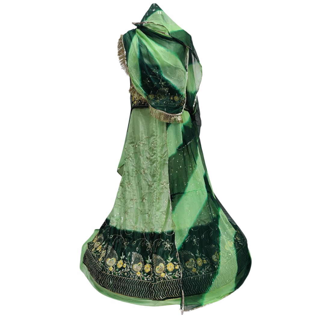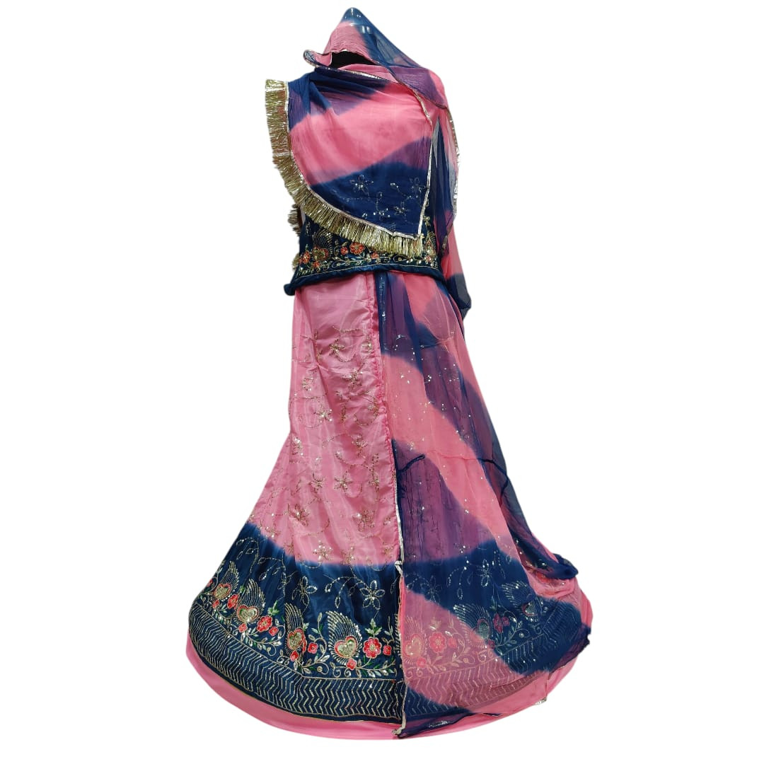 Add timeless elegance to your daily wardrobe with this beautiful Rajputi Poshak, crafted in soft Crepe fabric for all-day comfort. Designed with heavy sequin work, this dress is perfect for casual yet graceful ethnic styling. It features a vibrant multicolour Nazmin chiffon odhani (2.25 meters), adorned with delicate Gotta Kinari and Turi lace, bringing a traditional charm to your everyday wear.