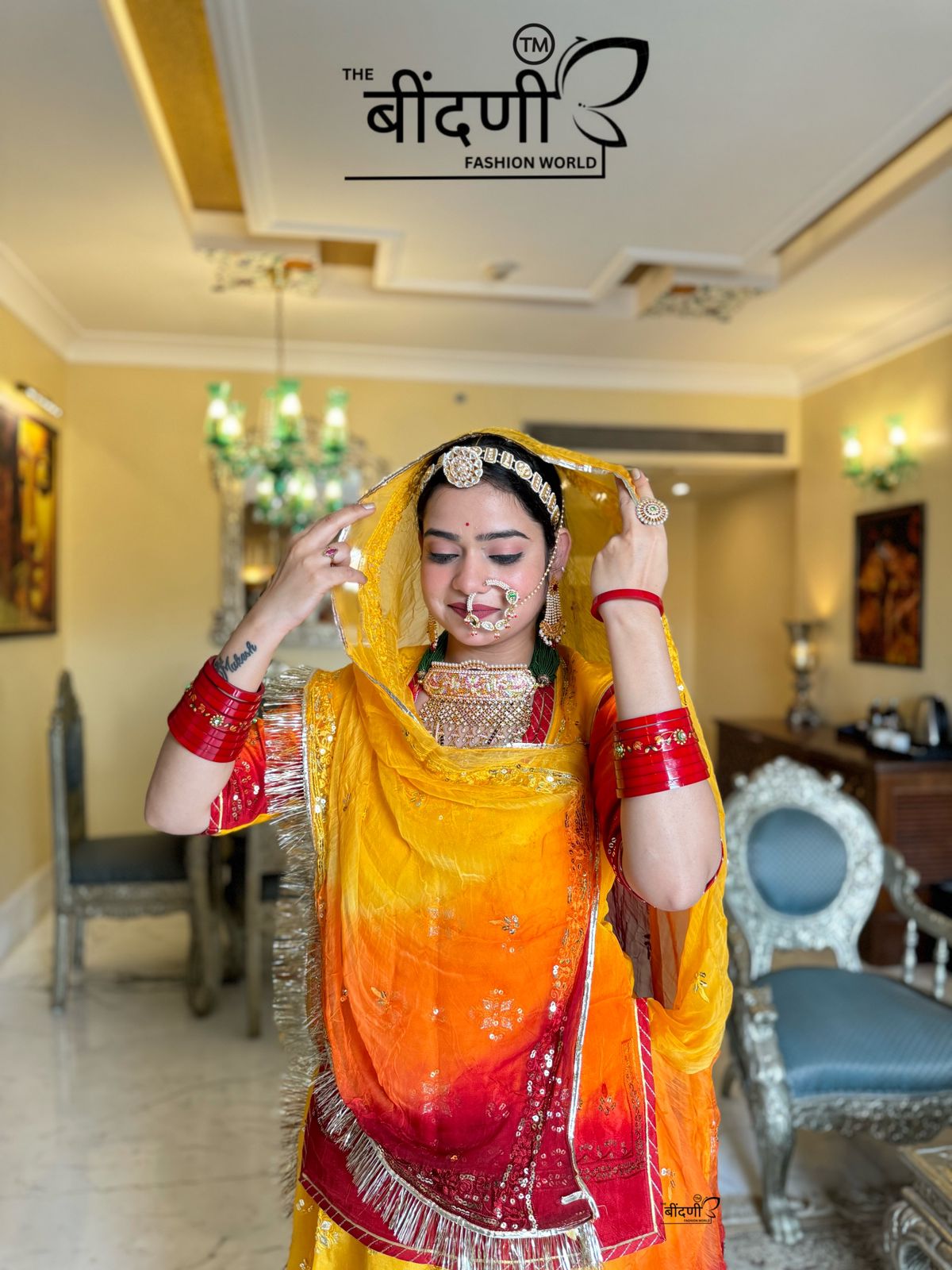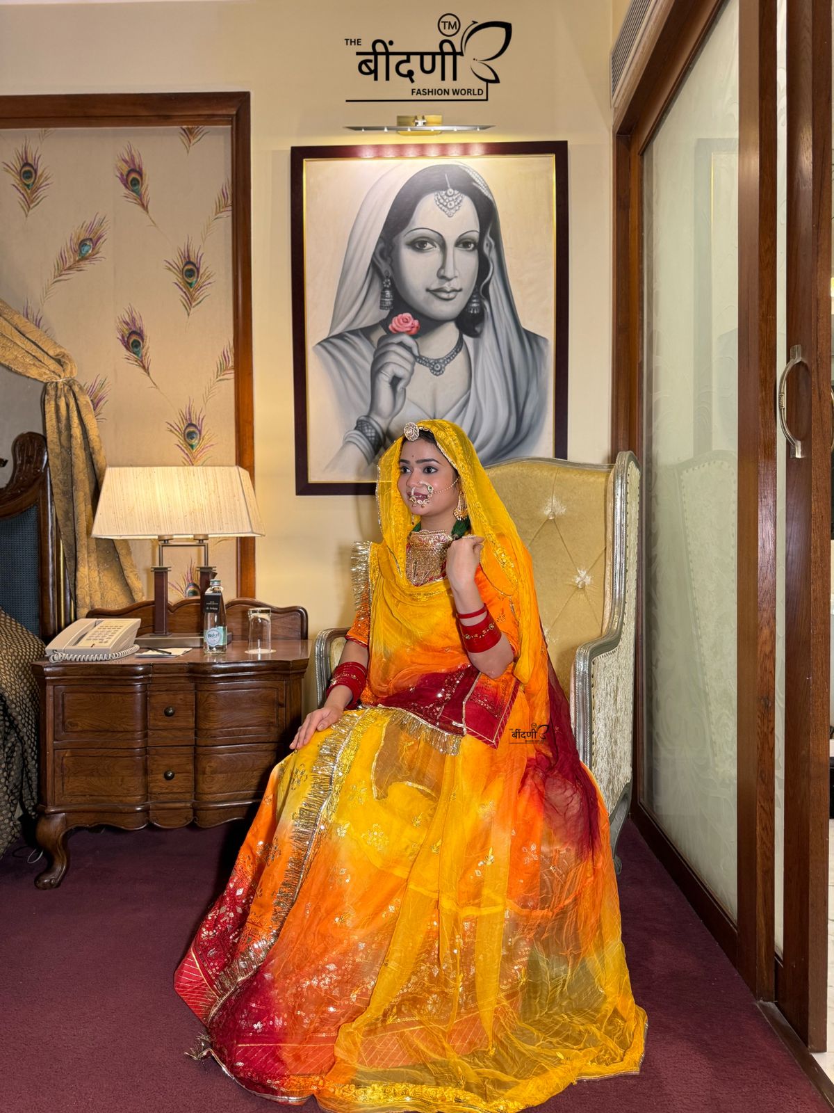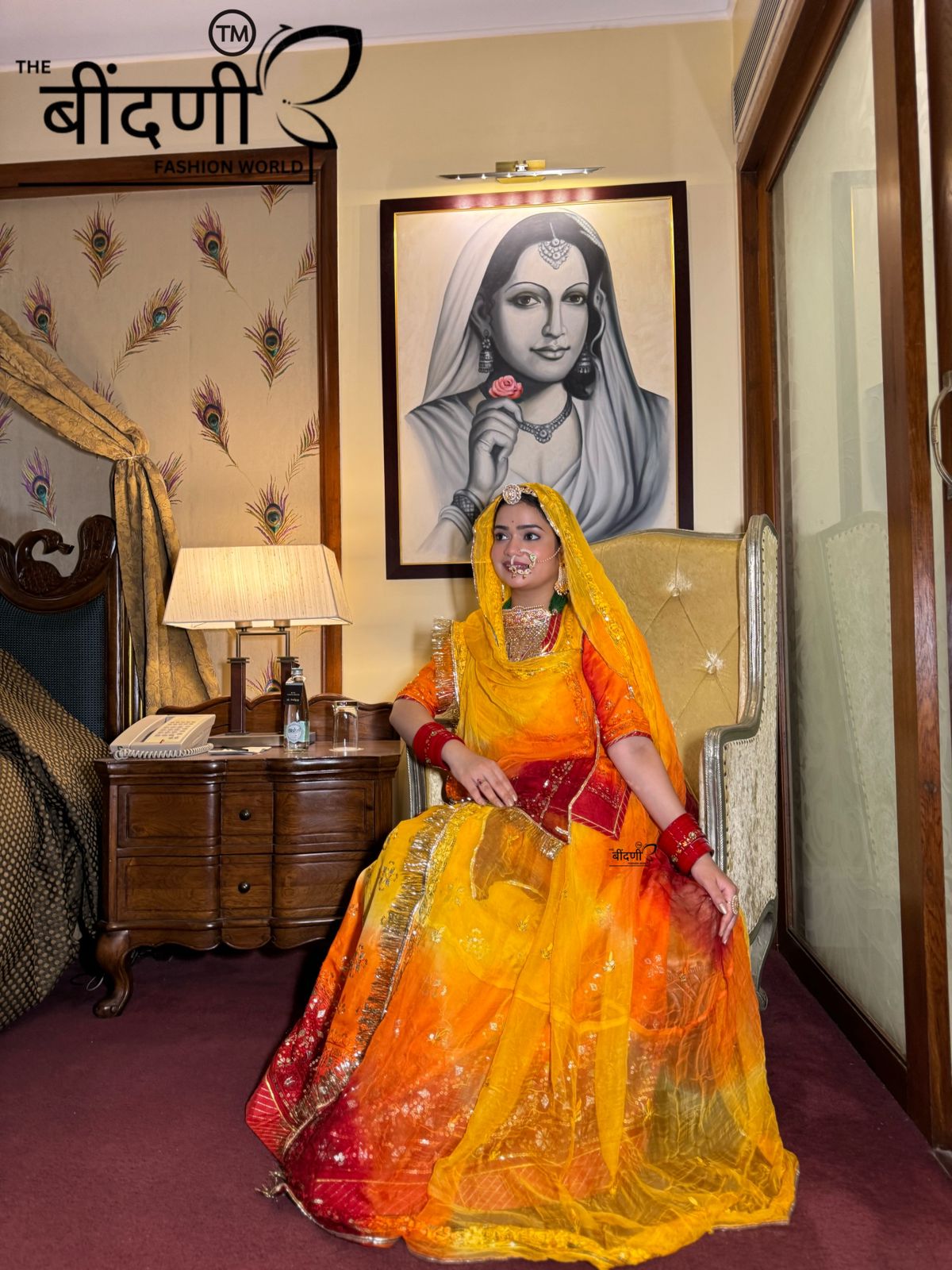 Ideal for festive celebrations, weddings, or any special event, "Sunset Glow" captures the essence of joyous elegance. Embrace the warmth and beauty of this stunning Upada poshak, and let your presence shine with radiant charm.