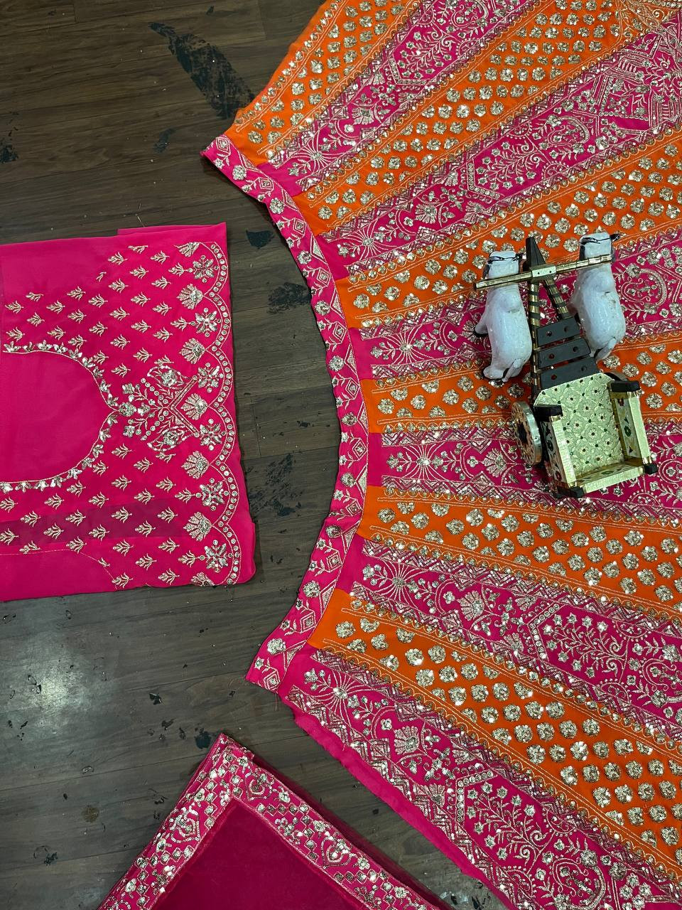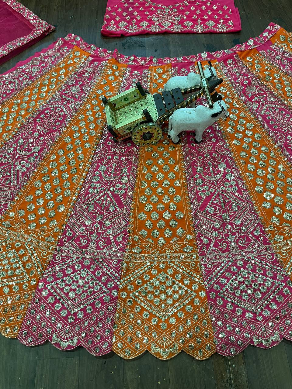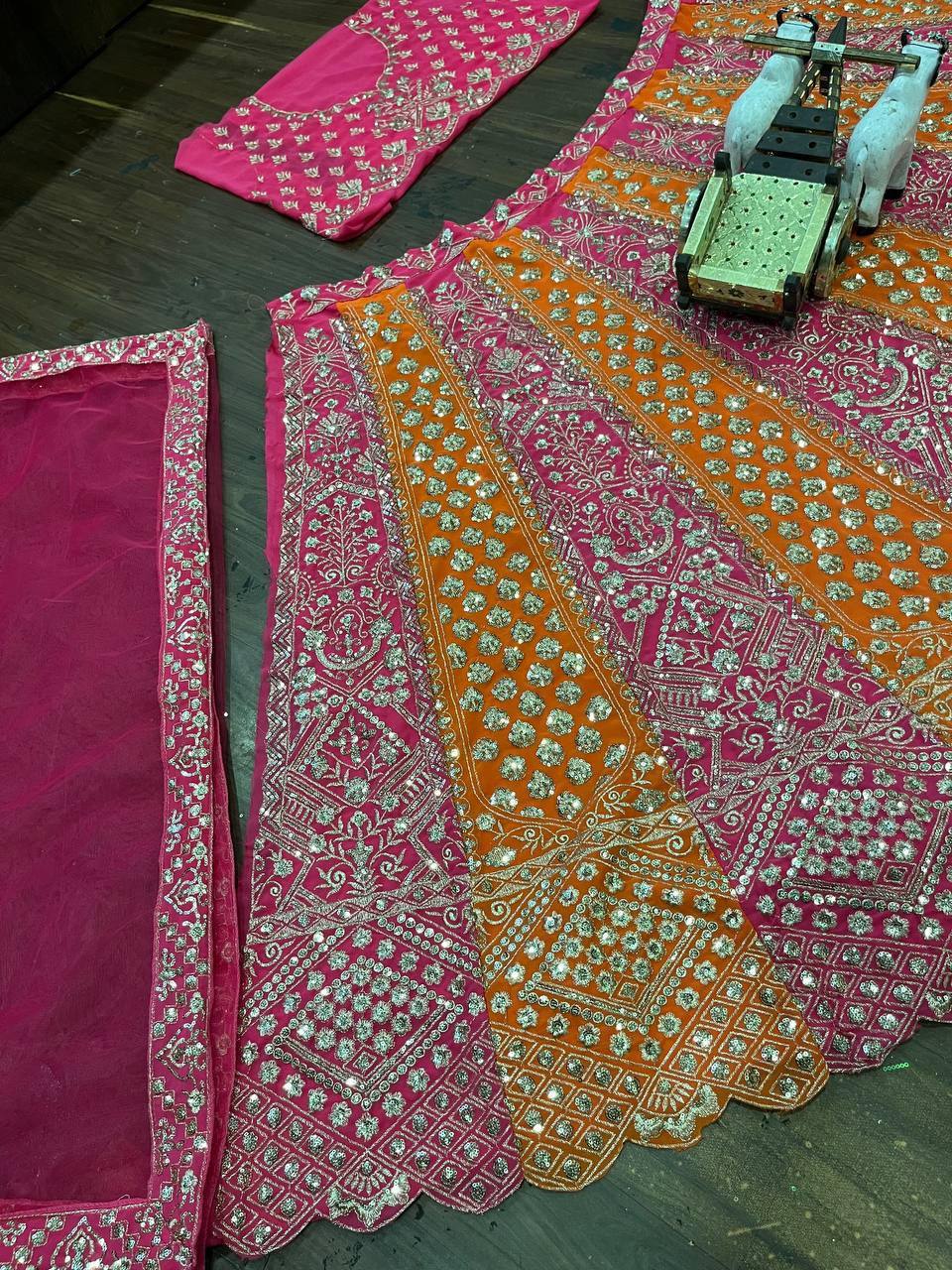 Step into elegance with our luxurious Fox Georgette Lehenga Set, exquisitely designed with shimmering sequins embroidery and cut work detailing. This stunning ensemble features a 4-meter flare for a voluminous royal look, enhanced with Cancan and Canvas Patta for perfect structure and flow.