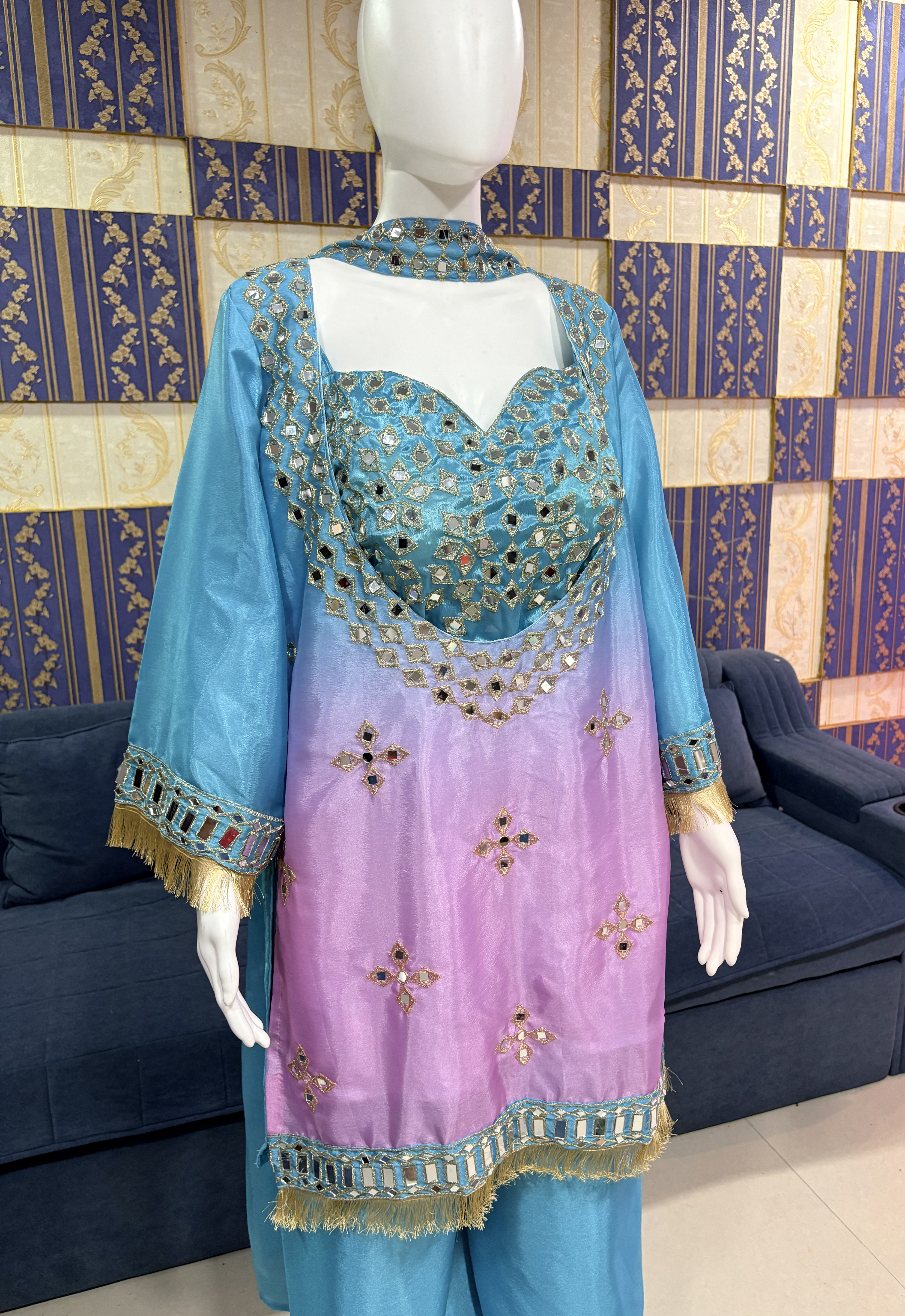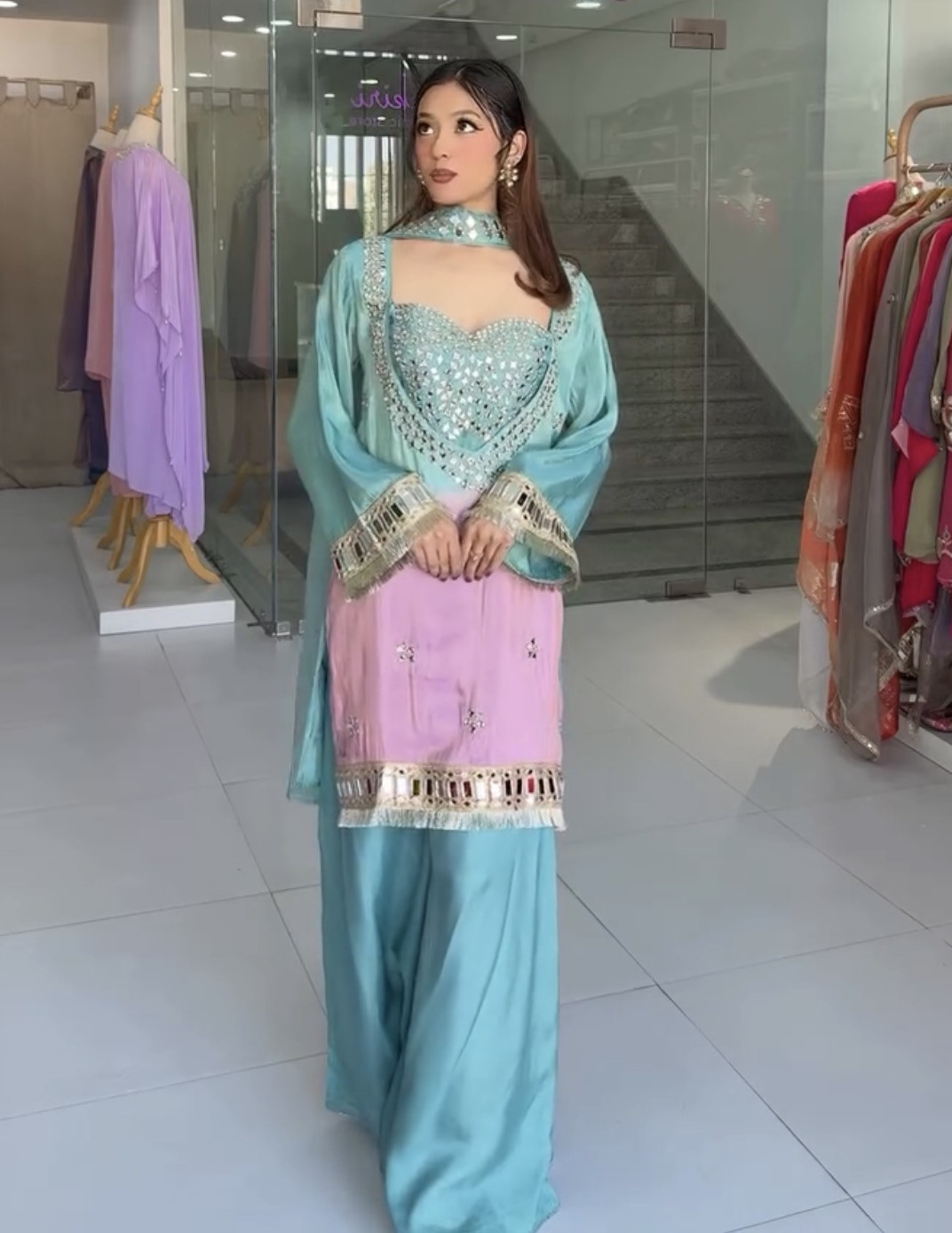 The stitched Chinon Silk top is enhanced with intricate real mirror embroidery that adds royal elegance to your overall look. It comes paired with a stylish stitched Chinon Silk palazzo, providing both comfort and graceful flare. Completing the set is a stunning 2.3-meter Chinon Silk dupatta featuring matching mirror embroidery work, making this outfit perfect for festive occasions, weddings, parties, and cultural events.