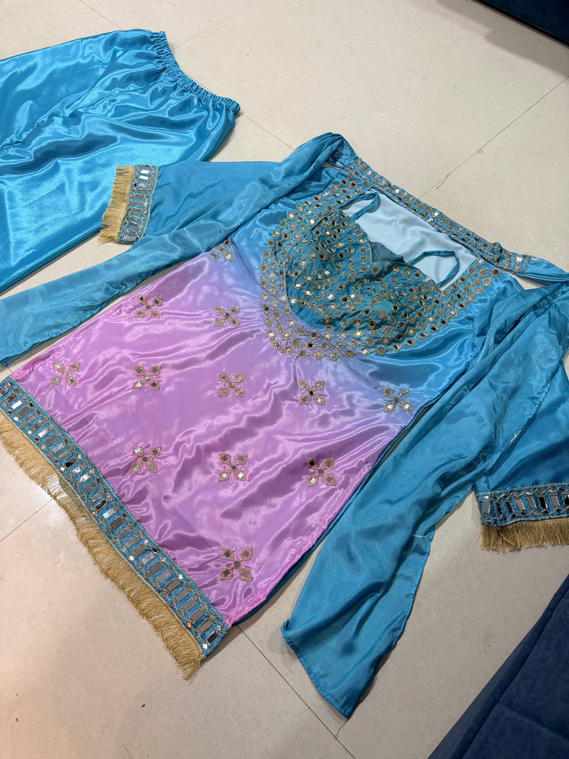 Upgrade your festive and wedding wardrobe with this luxurious Chinon Silk Kurta Palazzo Set beautifully designed with elegant Real Mirror Embroidery Work. Crafted with exceptional quality fabric, this outfit offers the perfect blend of glamour, comfort, and traditional charm.