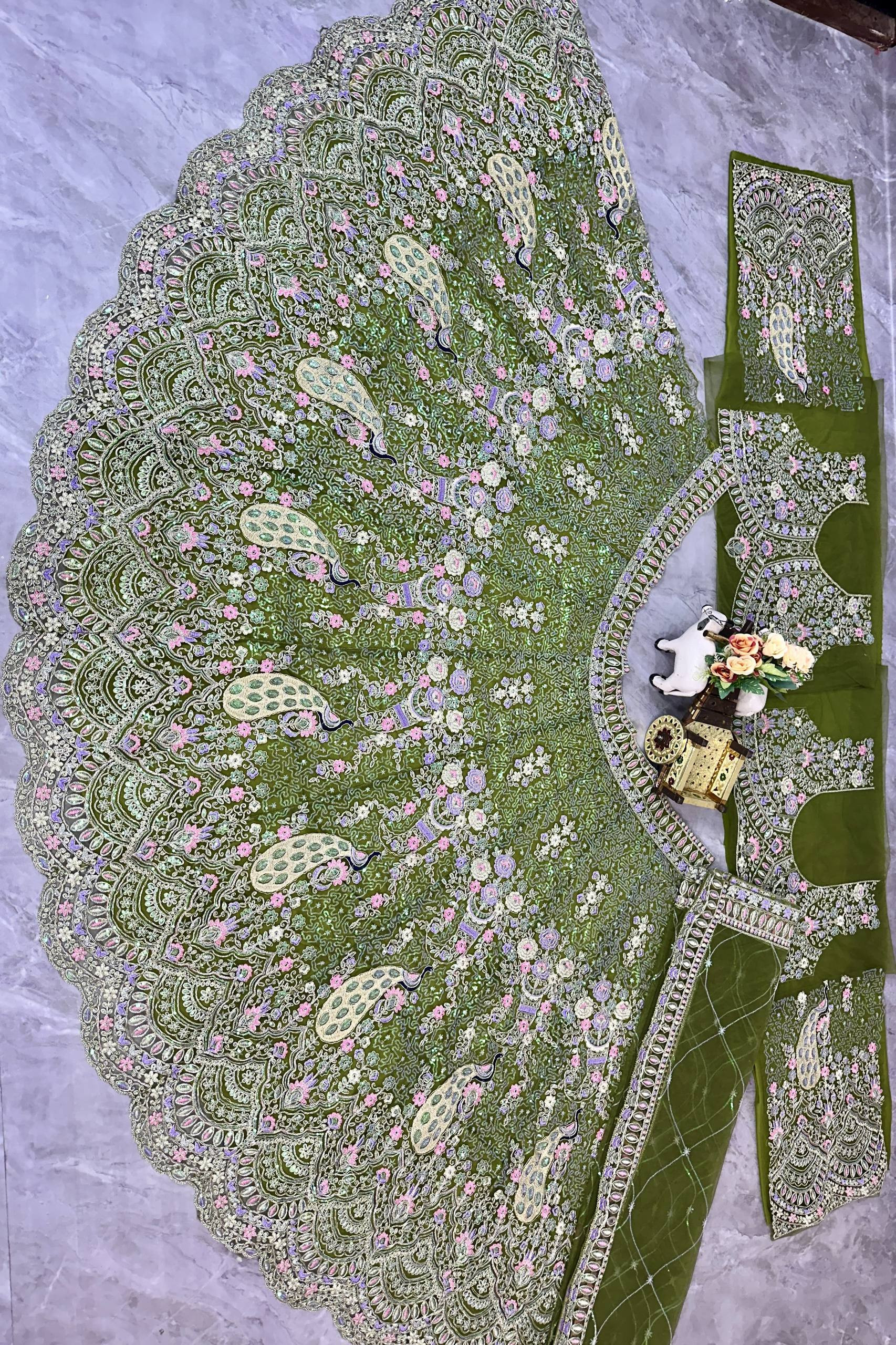The lehenga comes with a 4-meter grand flare, ensuring a graceful and voluminous look perfect for weddings, receptions, festive occasions, and party wear. The semi-stitched lehenga allows easy customization for a perfect fit.