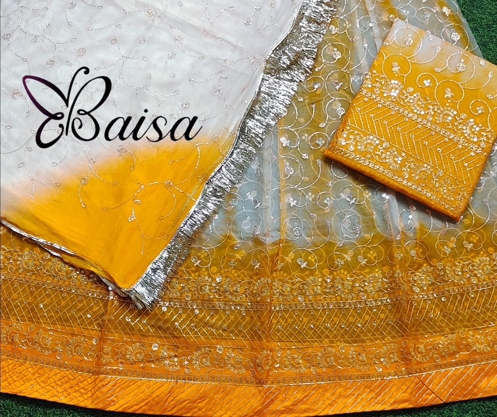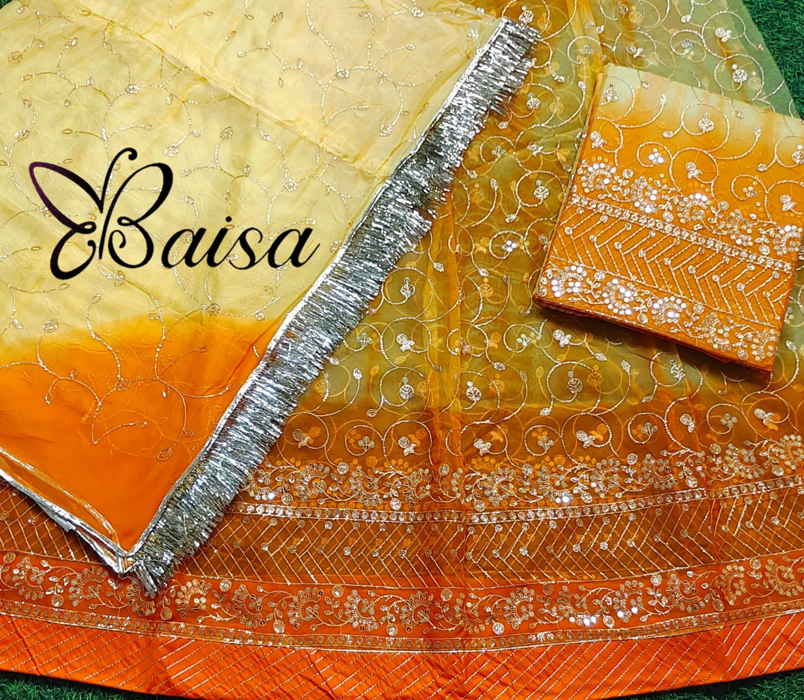 An organza poshak refers to a traditional garment, typically a type of sari or lehenga, made from organza fabric. Organza is a delicate, sheer, and lightweight fabric, often used in formal and festive clothing due to its elegance and shimmering quality.