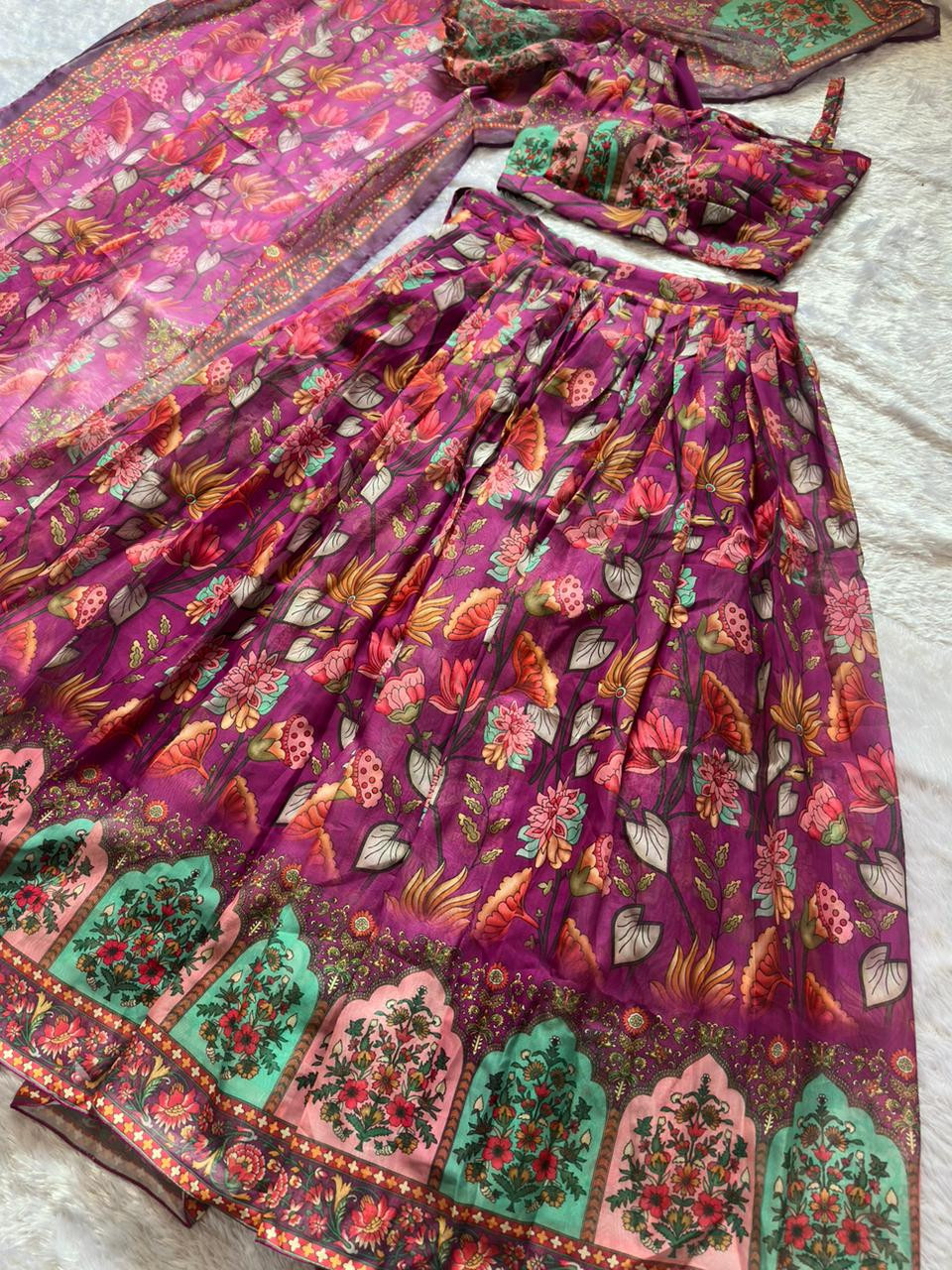 Lehenga – A stunning Pure Organza Silk all-over floral printed lehenga designed with rich multi-panel flair, approx. 4.5 meters of graceful flow.
