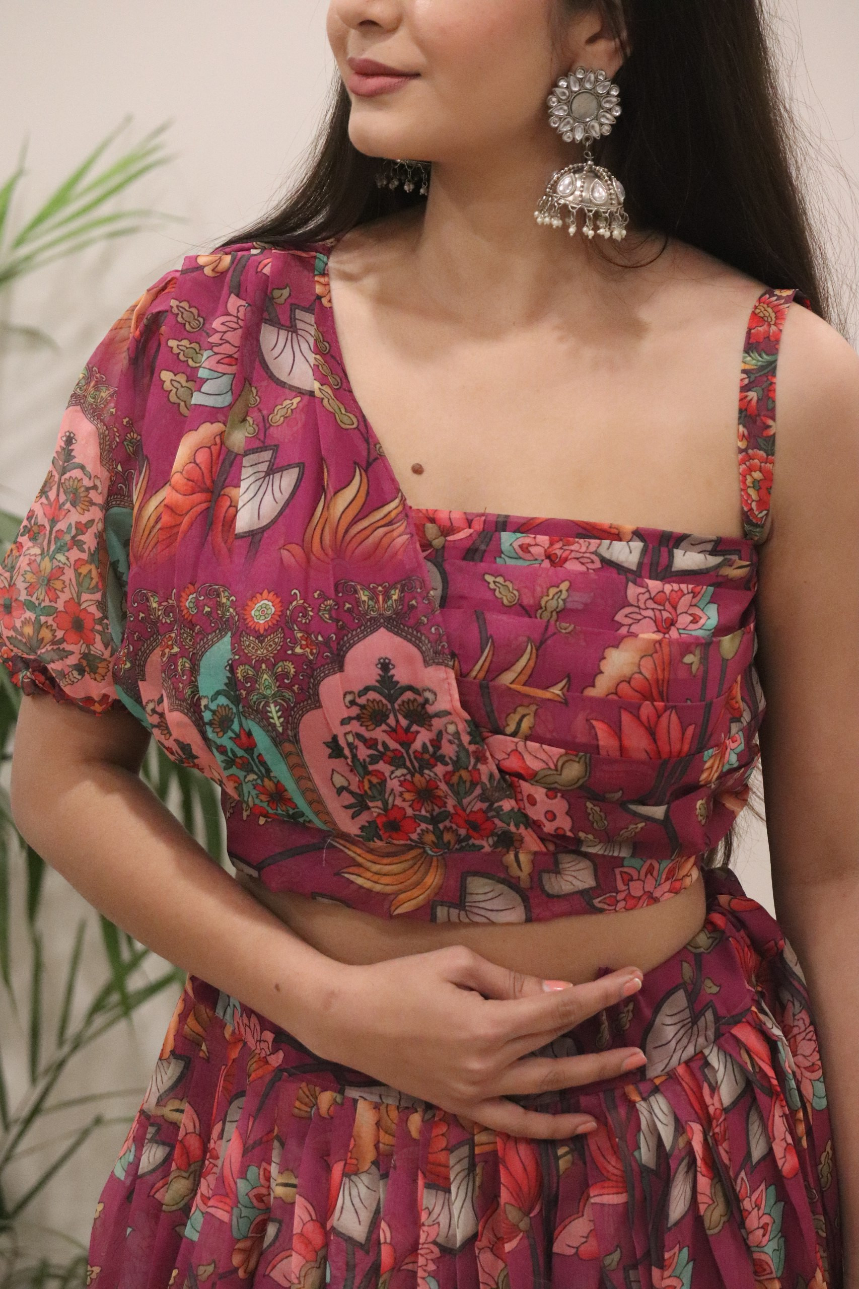 Blouse – A stylish Pure Organza Silk printed blouse in a rich wine tone.Comes padded for comfort, size 38 with margin available for a perfect fit.