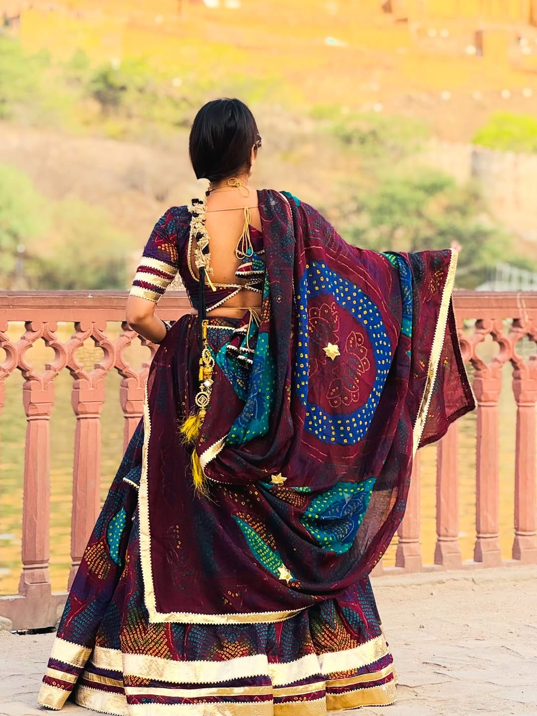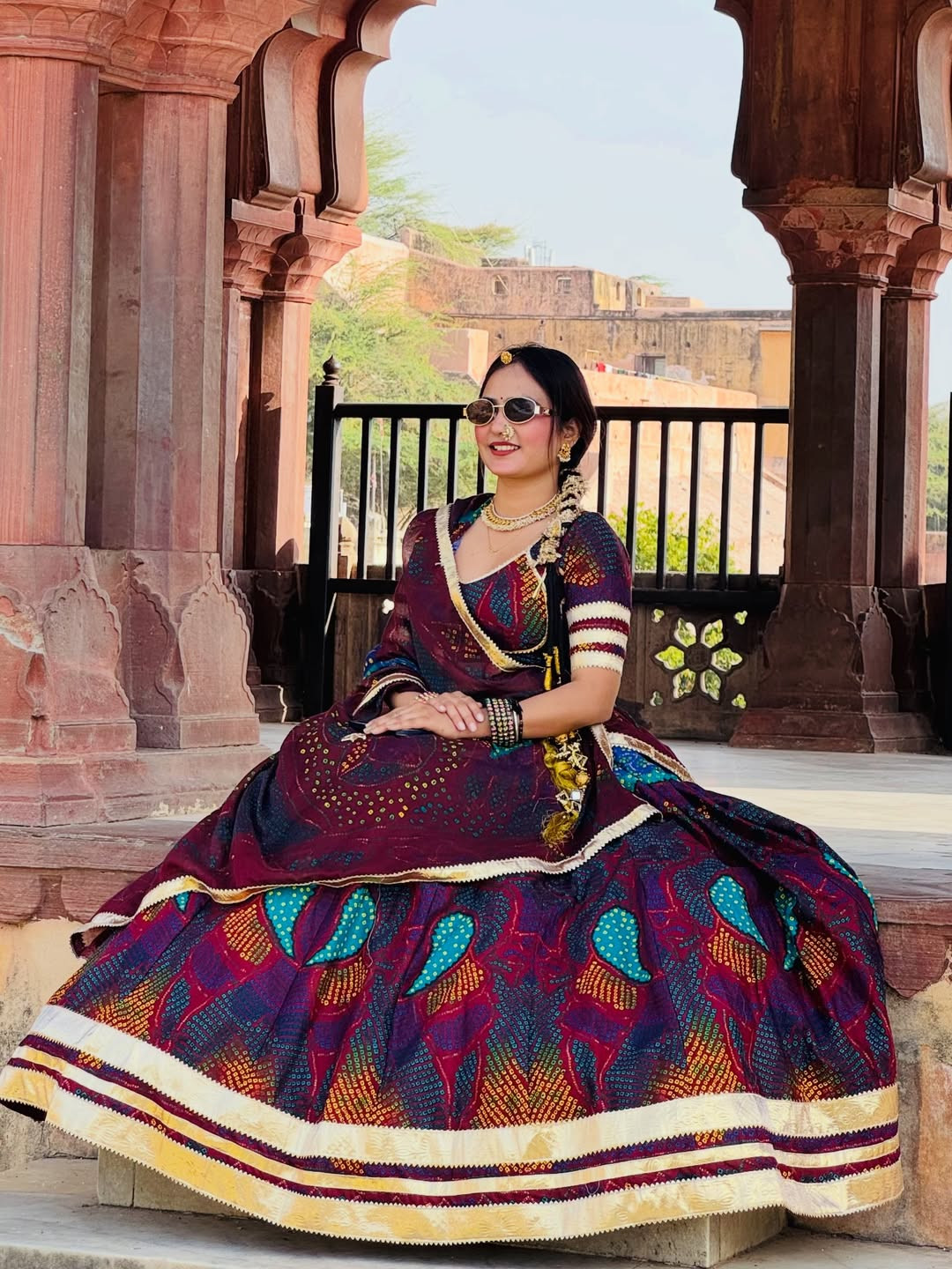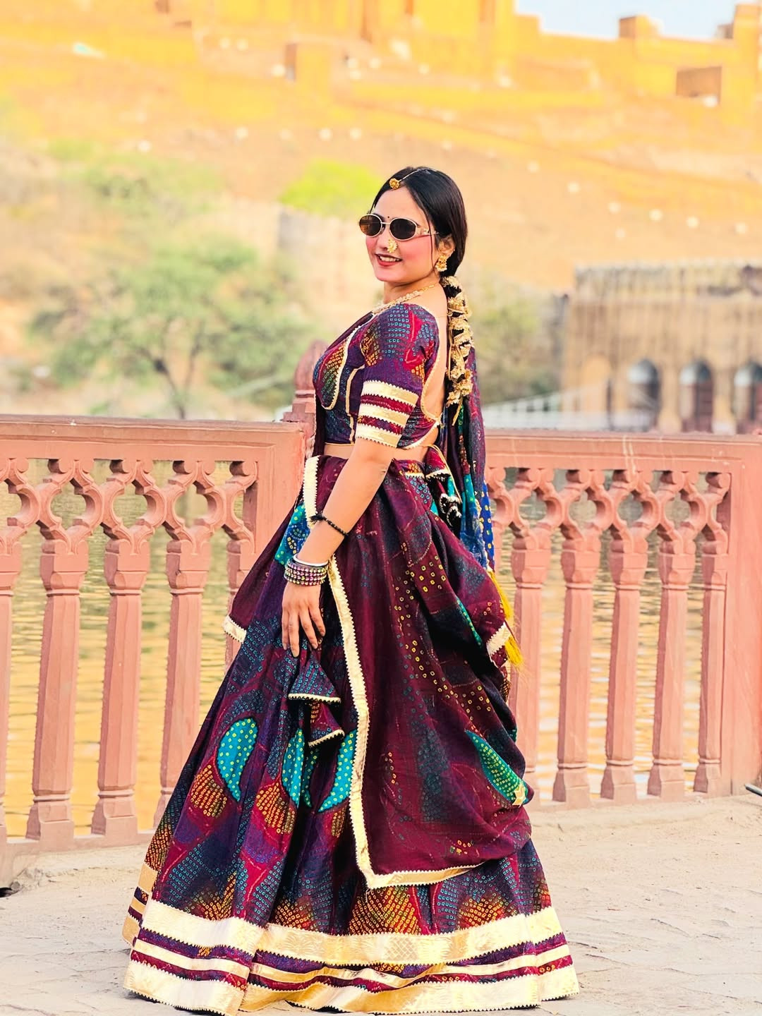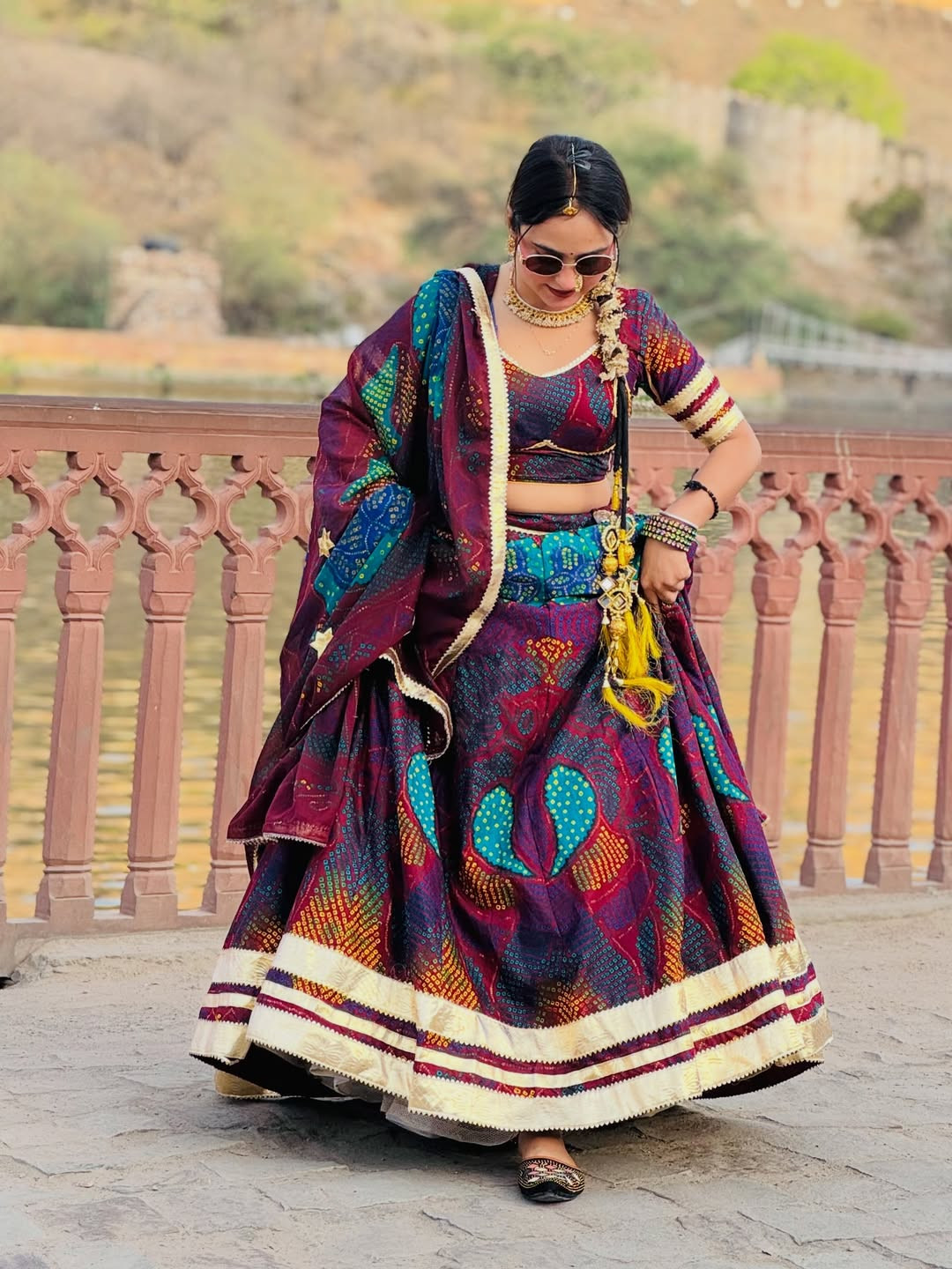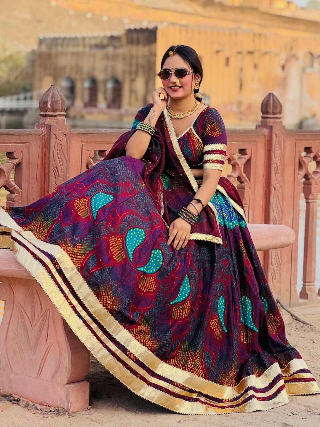 The lehenga comes fully stitched with a grand 4-meter flare, ensuring a graceful and royal look. Paired with an unstitched chiffon blouse fabric, you can customize it to your perfect fit and style. The matching Bandhej dupatta (odhni) completes the traditional Shekhawati vibe beautifully.