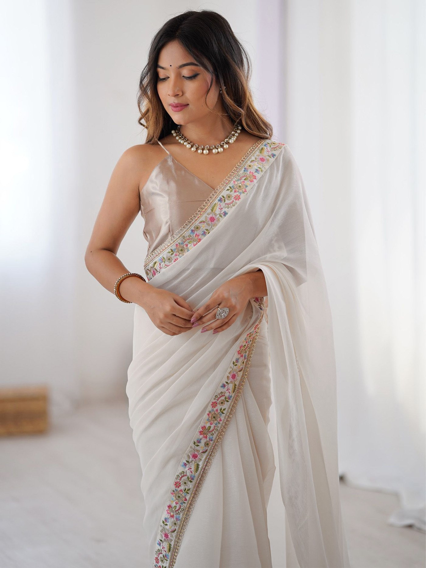 The saree comes paired with a matching un-stitched blouse made from rich Mety Silk, enhanced with delicate embroidery work to complete the elegant look. Its classic white colour exudes purity and charm, making it a must-have addition to your ethnic wardrobe.