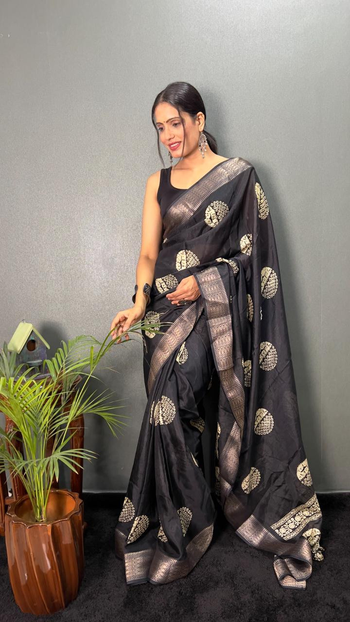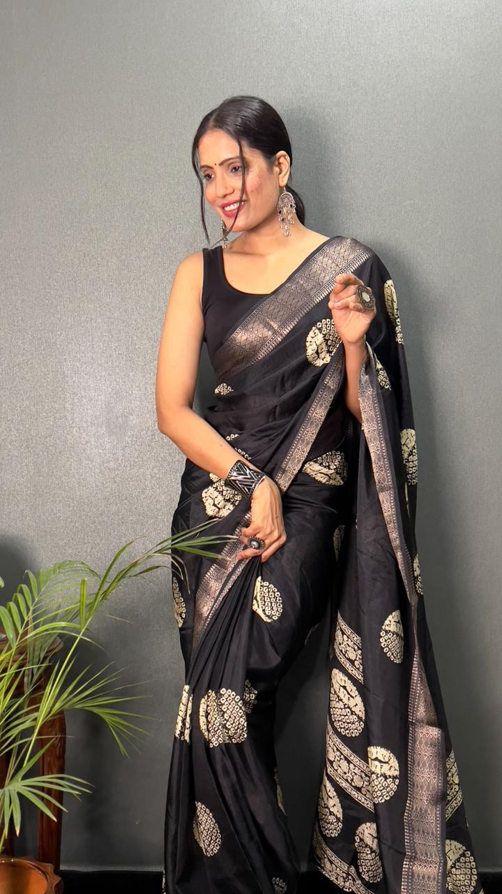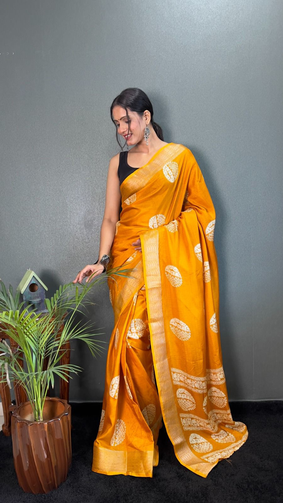 Gracefully designed in timeless Batik-style print, this saree features a beautifully zari-woven border and pallu, paired with a printed running blouse.