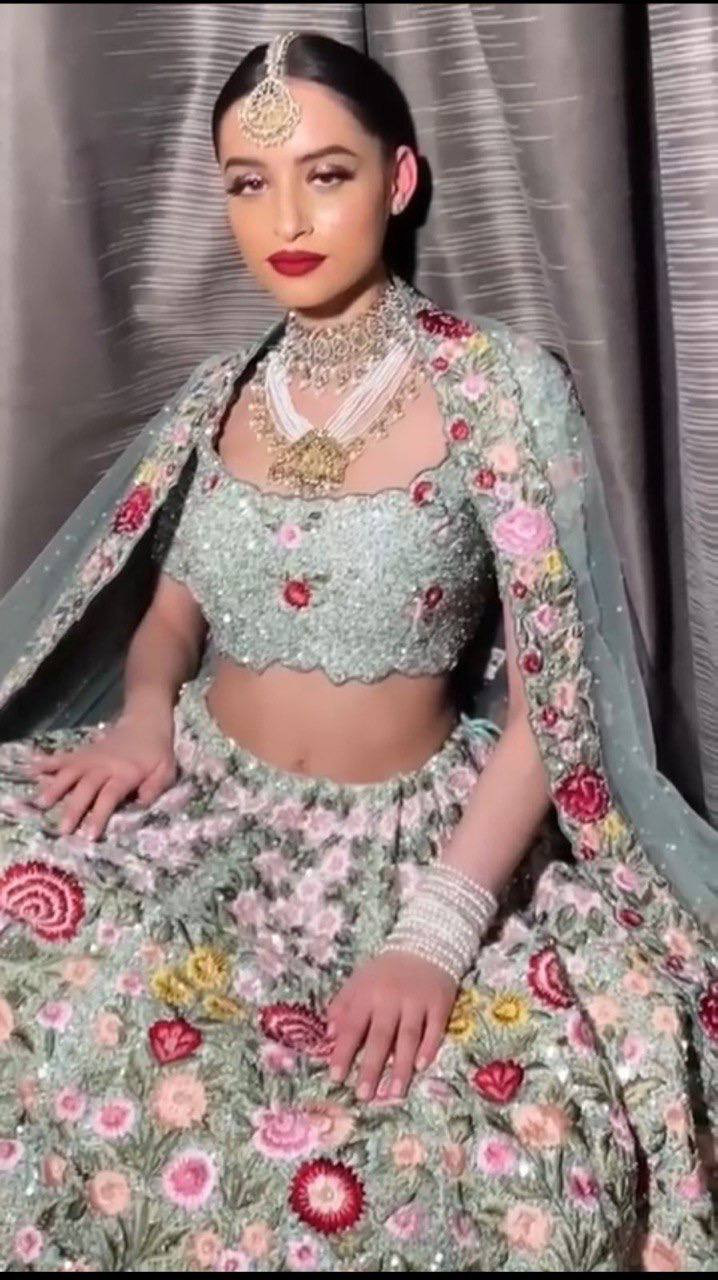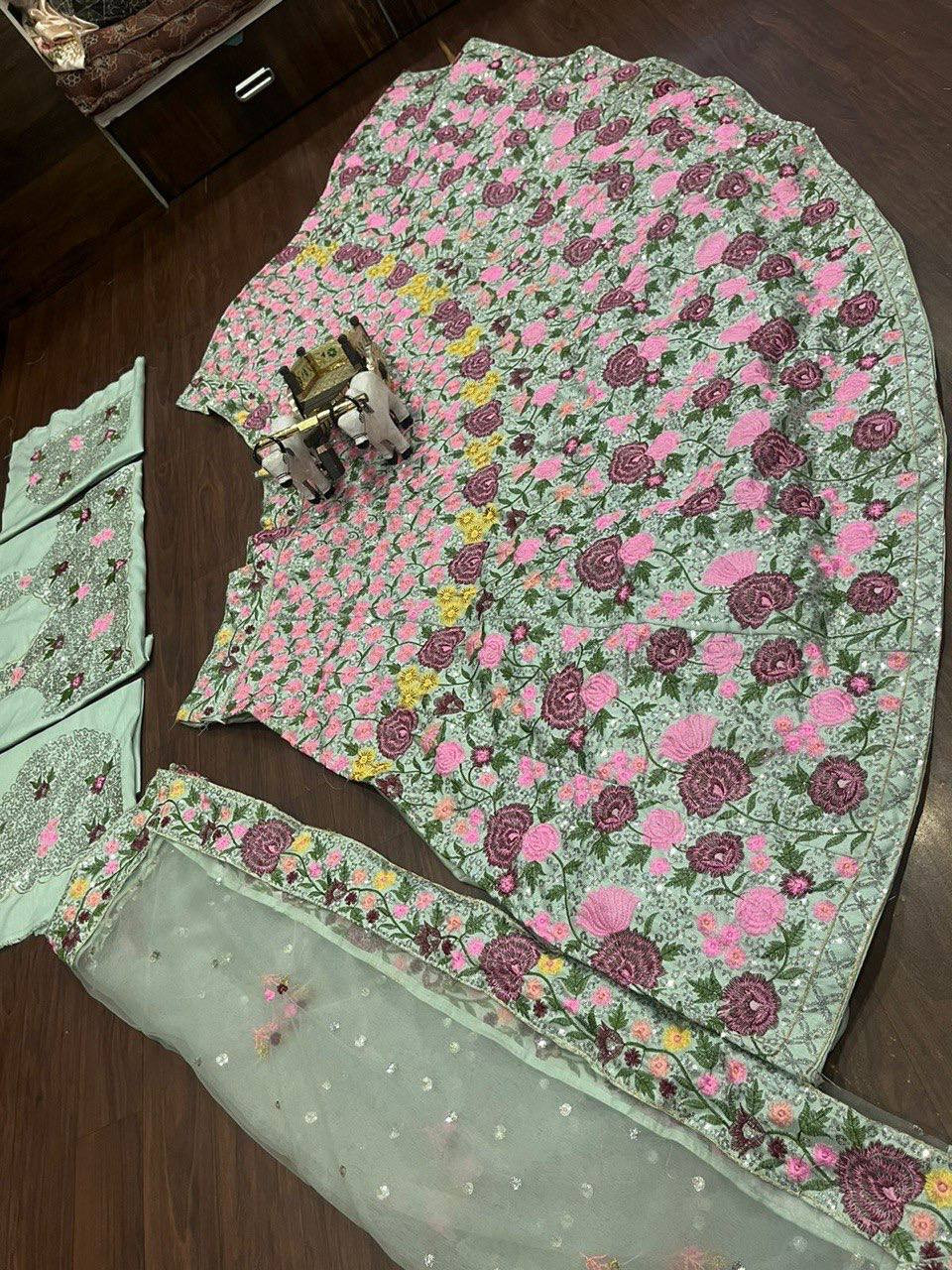 Turn heads with this exquisite Mono Satin Silk Lehenga adorned with intricate sequins embroidery, designed for grace and glamour. Perfect for weddings, festive events, or parties.