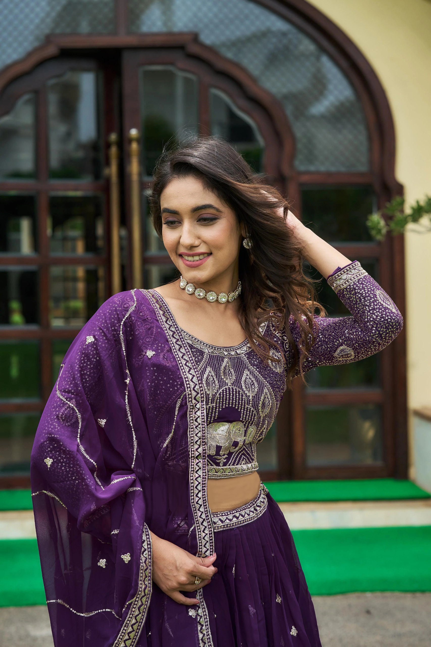 Elevate your ethnic style with this Embellished Purple Semi-Stitched Lehenga Choli crafted in premium georgette fabric. The lehenga features intricate zari embroidery and sequin detailing, paired with a free-size unstitched blouse for a customizable fit. The flowing dupatta with elegant embroidered lace completes the regal look, making it a perfect choice for weddings, festive celebrations, parties, and special occasions.