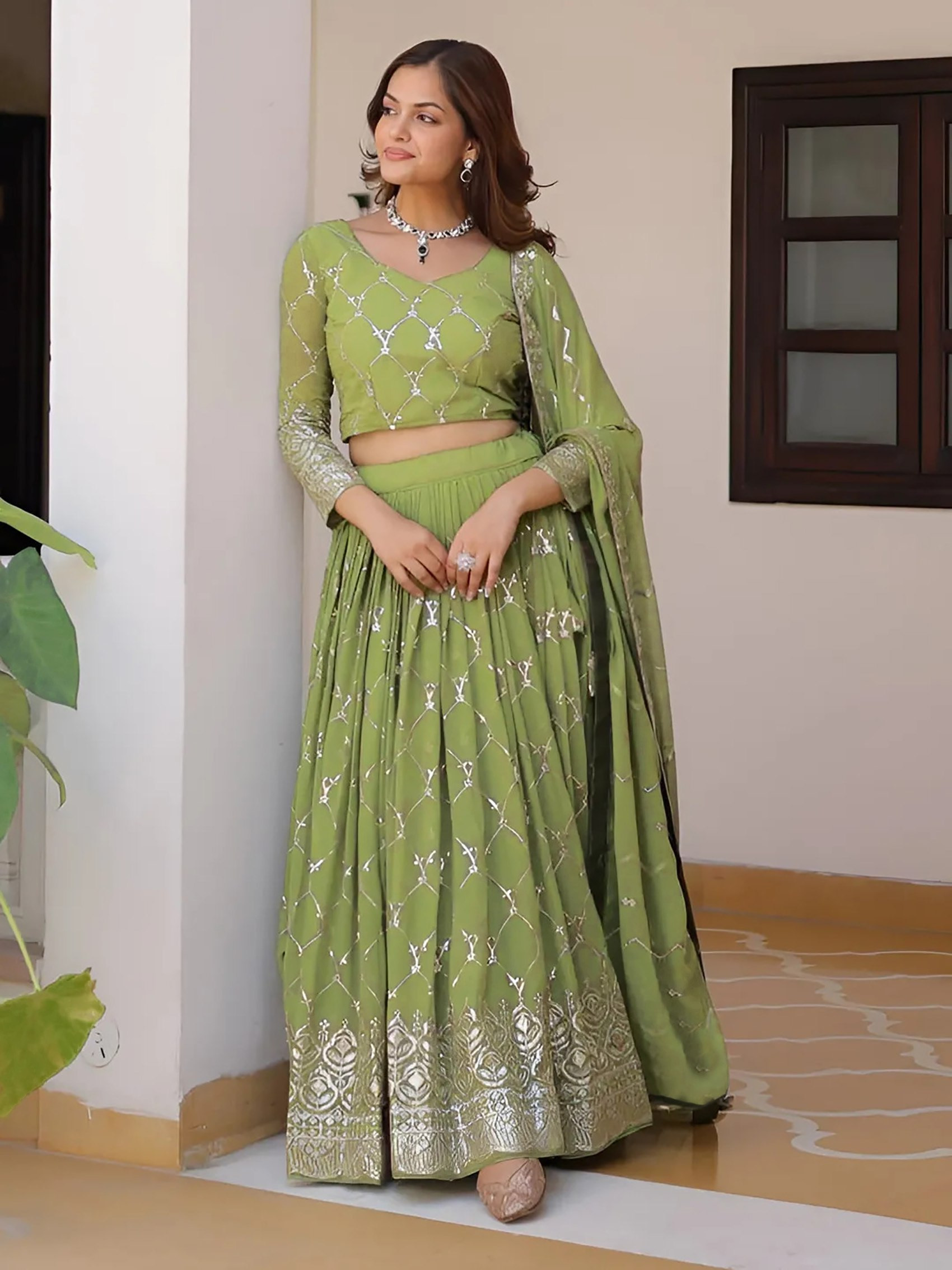 Elevate your ethnic style with this beautifully embellished semi-stitched lehenga choli in pista green. Designed with fine zari embroidery and sequin lace work, this outfit blends elegance with comfort, making it perfect for weddings, receptions, festive occasions, and parties.