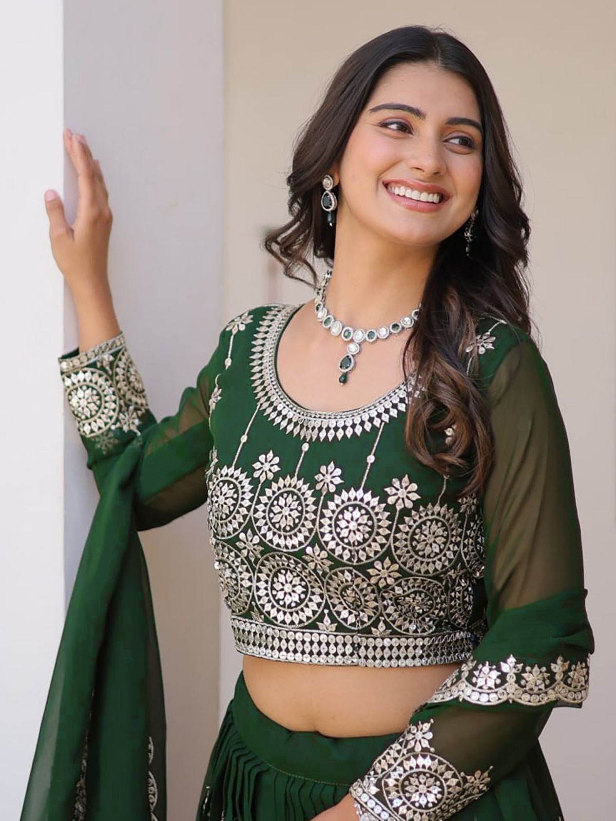 Elevate your festive and wedding look with this stunning Embellished Semi-Stitched Lehenga Choli in Green. Crafted from premium georgette fabric, the lehenga features a graceful 2.9-meter flair with full inner lining for added comfort and volume. Designed in a semi-stitched style, it offers customization up to 44-inch waist with a 43-inch length.