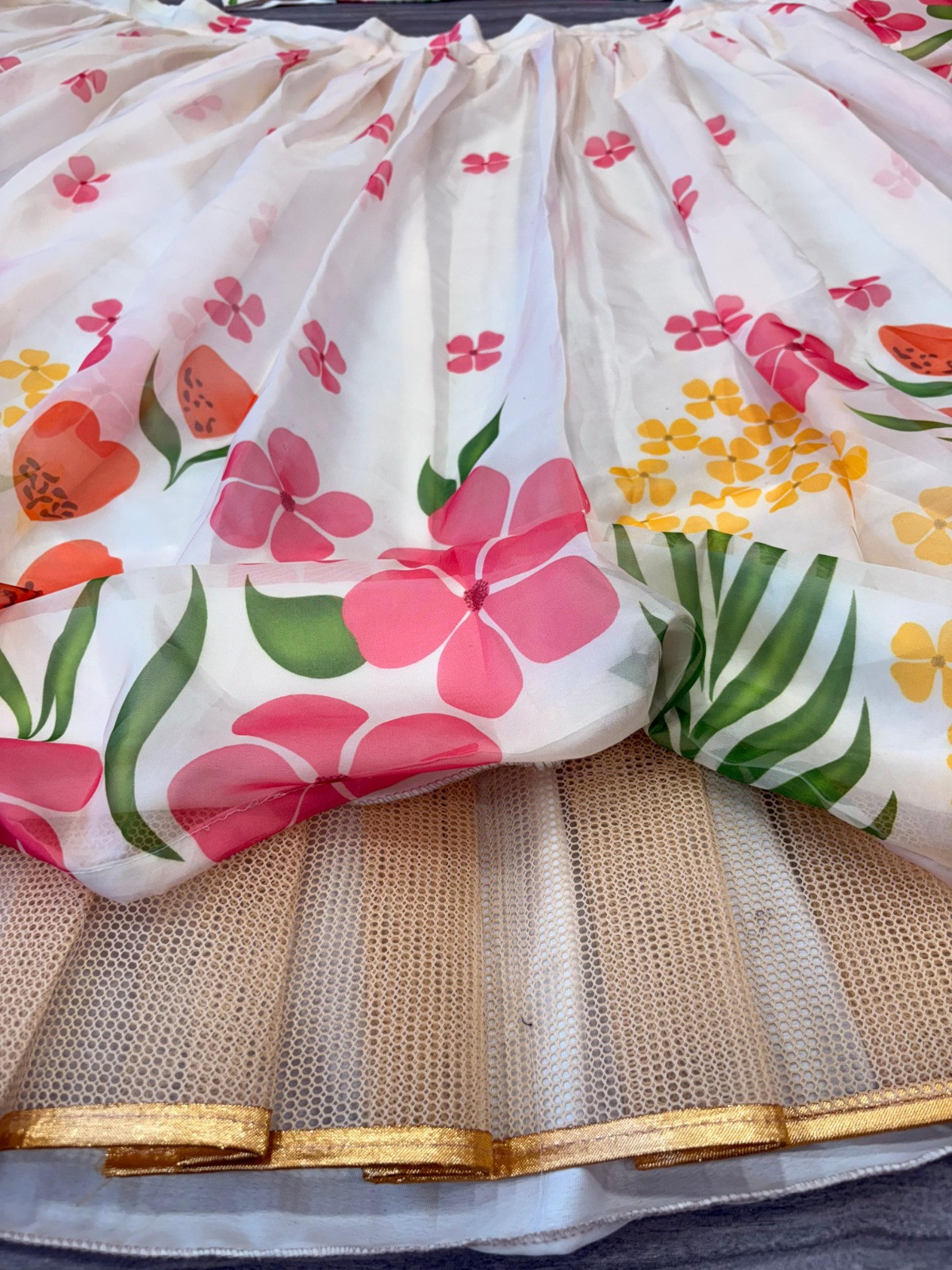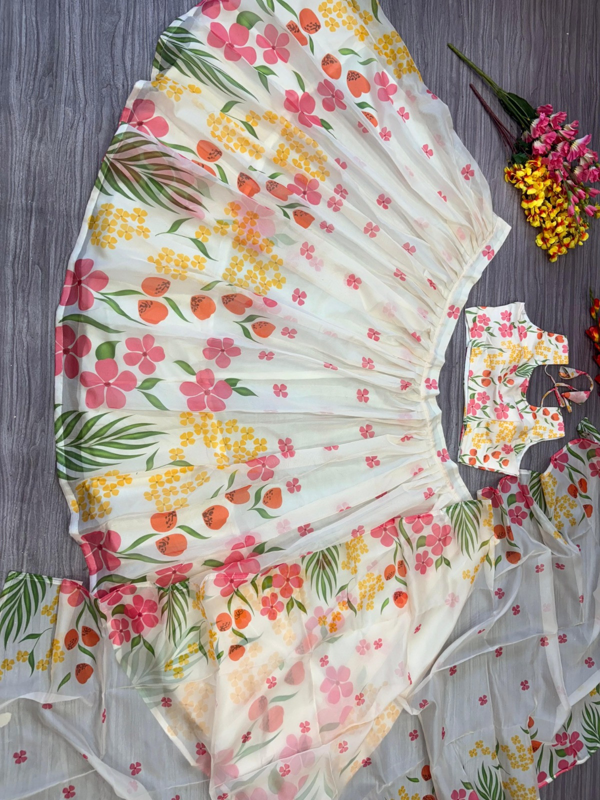 Lehenga: Made from premium tabby silk featuring beautiful floral prints, enhanced with heavy cancan and inner lining for a voluminous 3.5-meter flair. Semi-stitched design fits up to XXL for a comfortable and customizable fit.