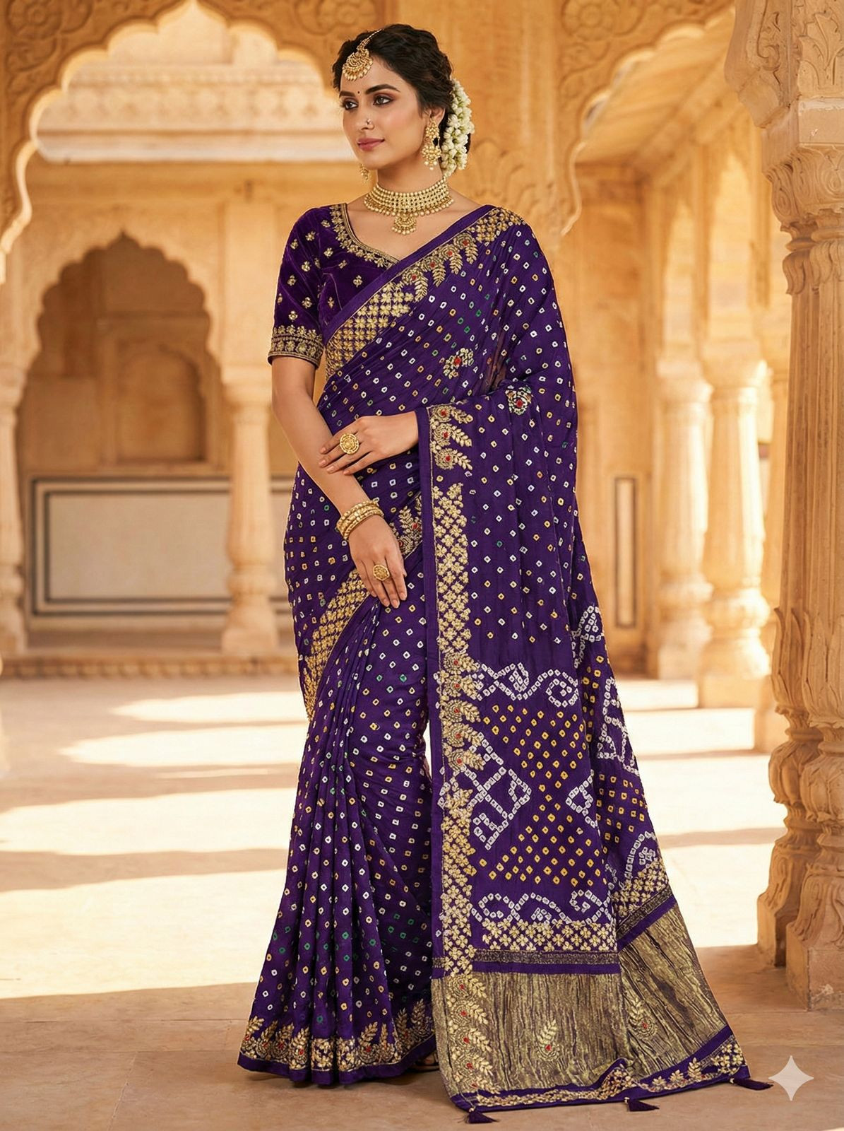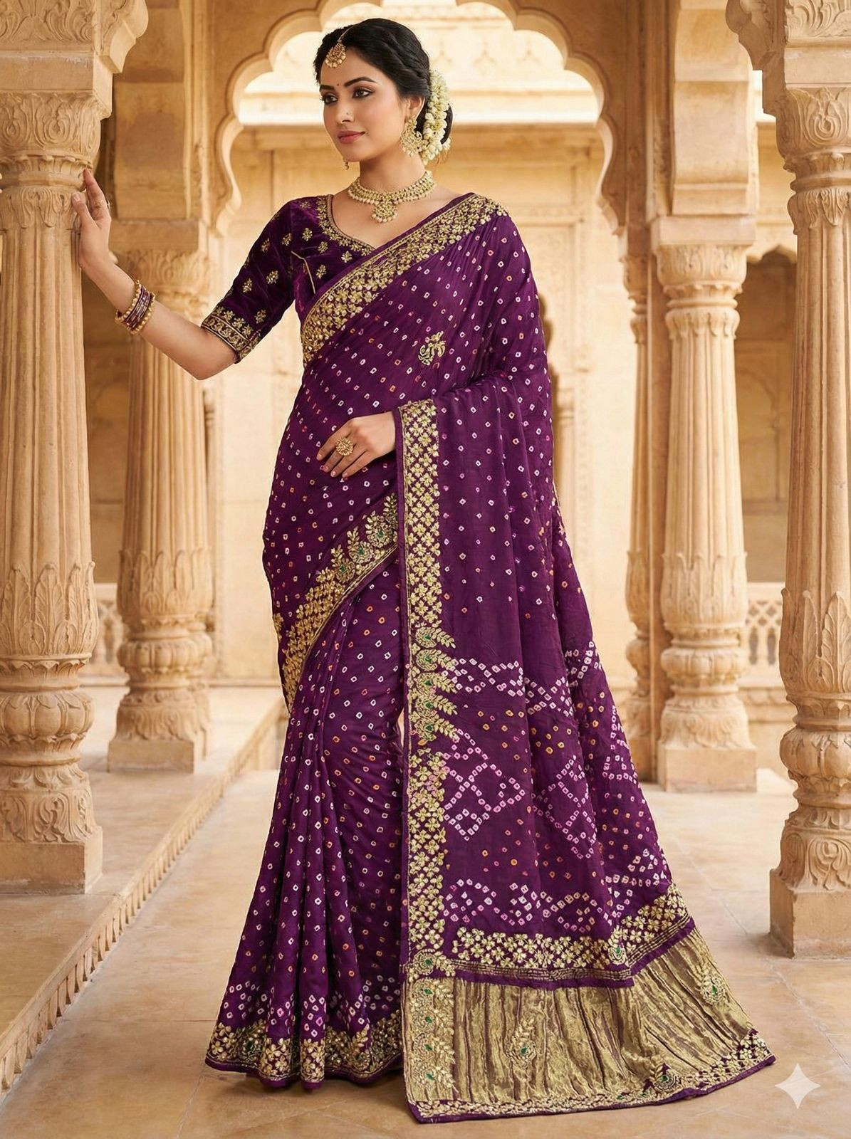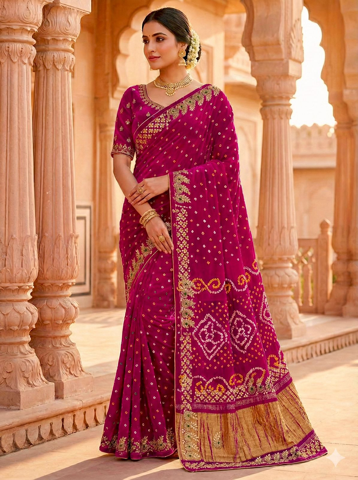 Drape yourself in the exquisite charm of our Gaji Silk Bandhani Saree, a true masterpiece of traditional Indian craftsmanship. Woven from the finest Gaji silk, renowned for its subtle sheen and luxurious drape, this saree boasts the intricate art of Bandhani, where tiny, precise knots create mesmerizing patterns that seem to dance with every movement. The vibrant hues are a celebration of festivity and joy, making this saree an ideal choice for weddings, special occasions, and cultural celebrations.