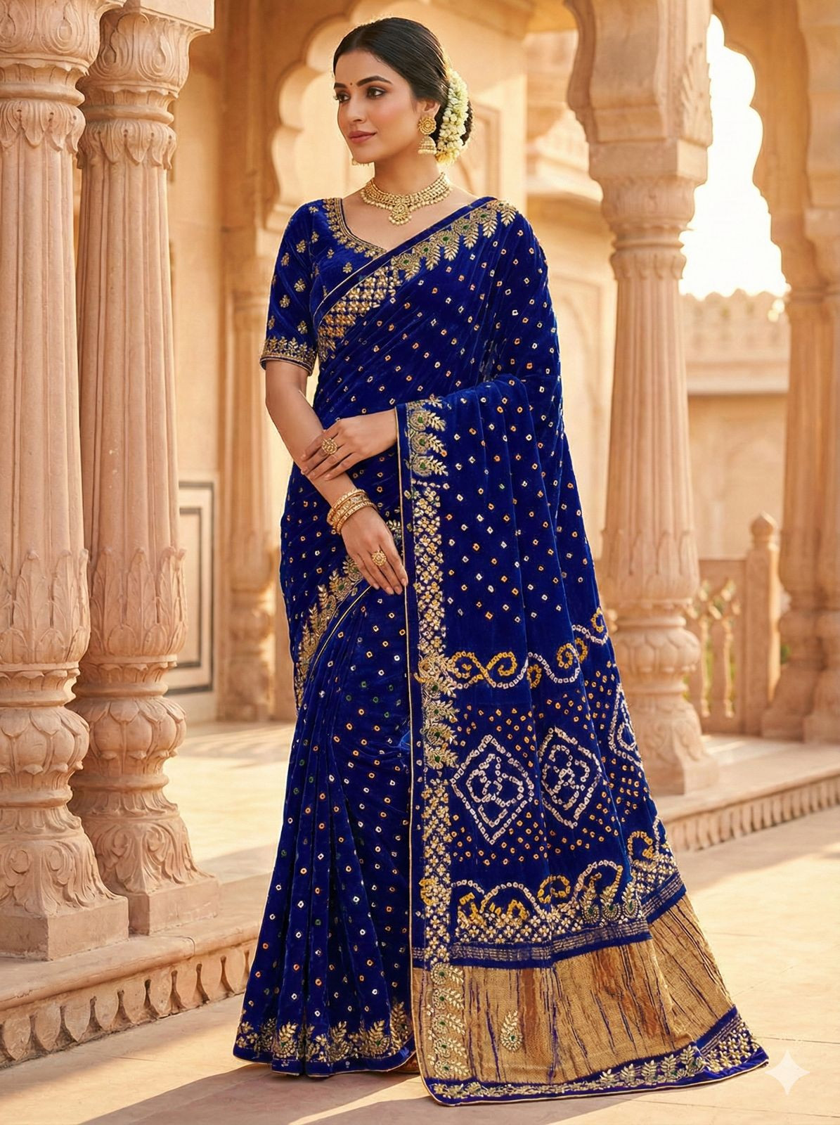 What truly sets this saree apart is the breathtaking, handcrafted Gota Patti work. Each delicate piece of metallic lace is meticulously hand-stitched onto the fabric, forming intricate floral motifs and traditional designs that add a layer of opulence and sparkle. This artisanal touch ensures that no two sarees are exactly alike, offering you a unique piece of wearable art. The combination of the lustrous Gaji silk, the captivating Bandhani patterns, and the shimmering Gota Patti work creates a symphony of textures and colors that will undoubtedly turn heads and earn you admiring glances.