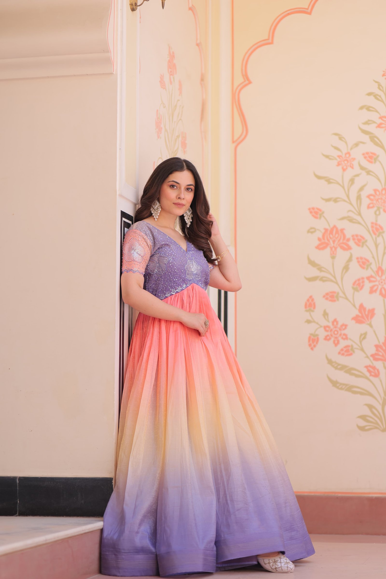 Available in sizes M (38), L (40), XL (42), and XXL (44), with a standard length of 56 inches, this ready-to-wear gown comes stitched with a canvas patta for a structured, elegant fit.