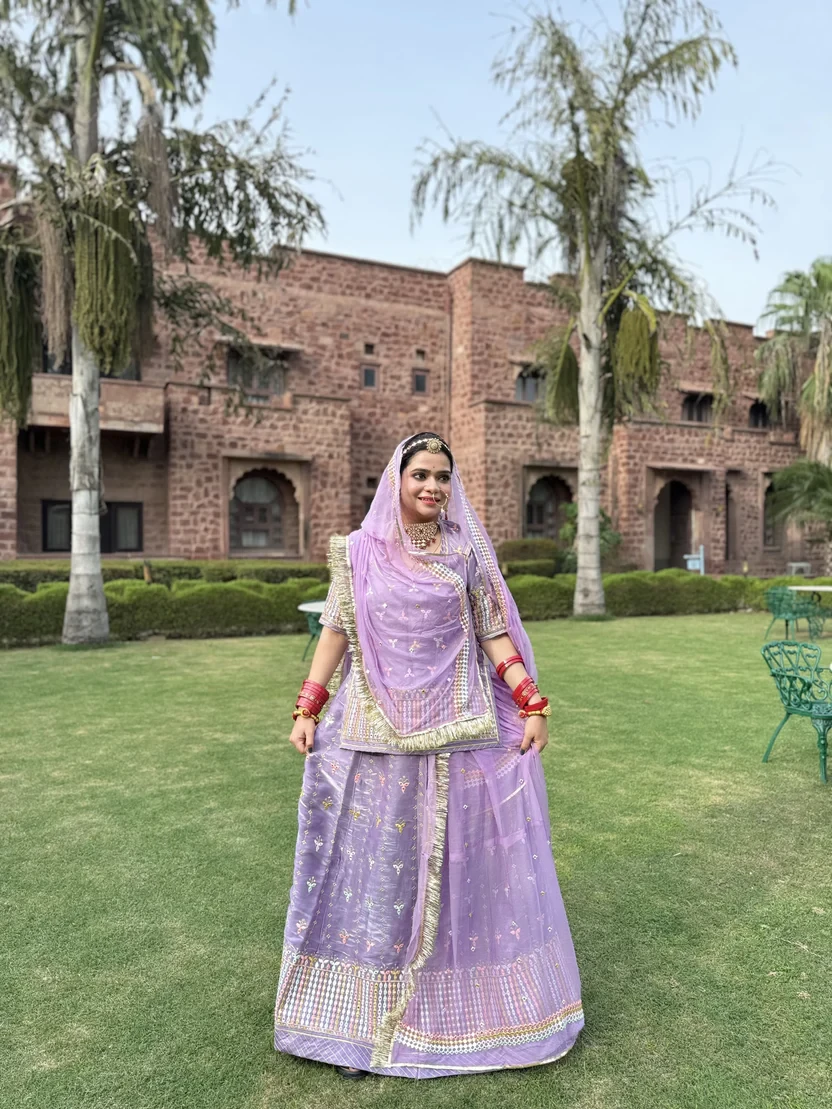 Grace meets tradition in Noor-e-Gulabi, a lavender Rajputi poshak crafted with a perfect blend of royal heritage and feminine charm. The soft lavender hue symbolizes serenity and elegance, while the golden gota-patti work adds a regal shimmer that captures the essence of Rajputana pride.