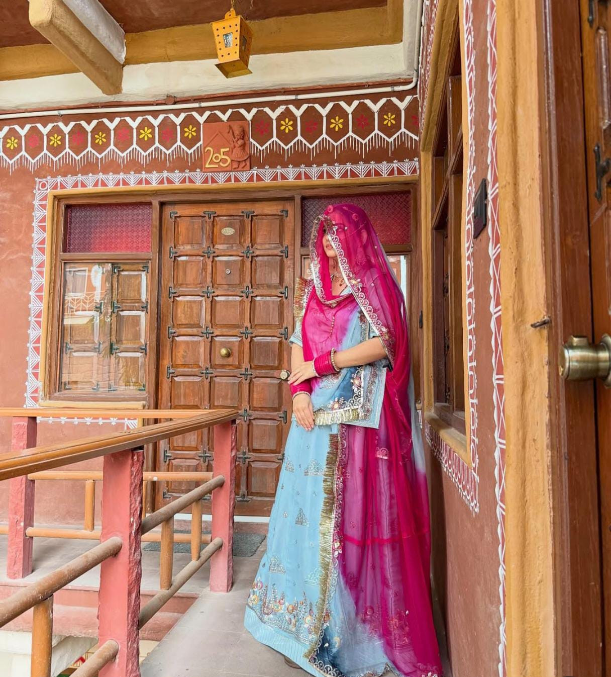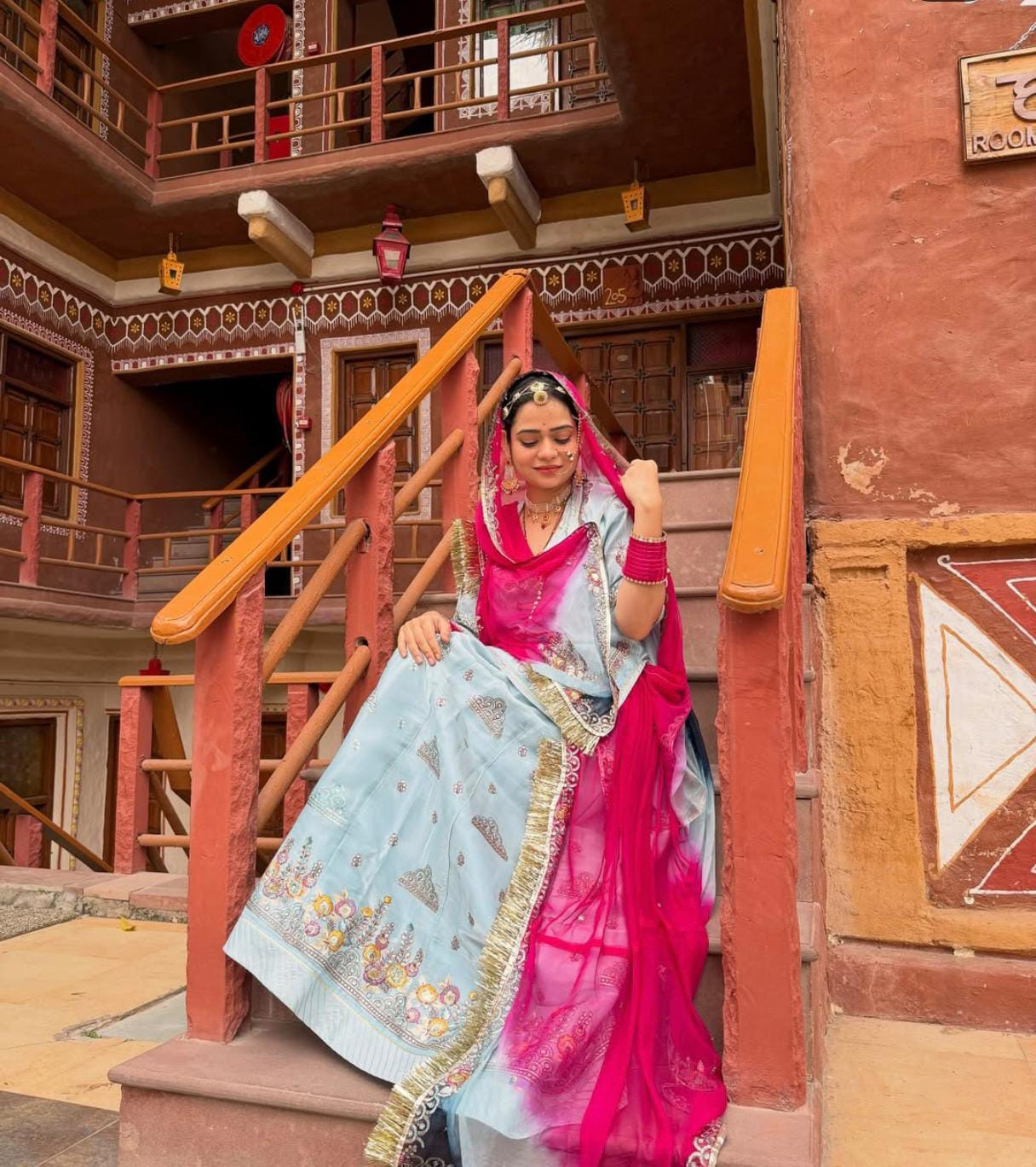 The set comes with a Premium Hamrahi Pyor Odhna, finished with complete Gota Kiran border, enhancing the grace and beauty of the ensemble. Perfect for weddings, parties, festive celebrations and special occasions, this Poshak delivers timeless charm and royal sophistication.