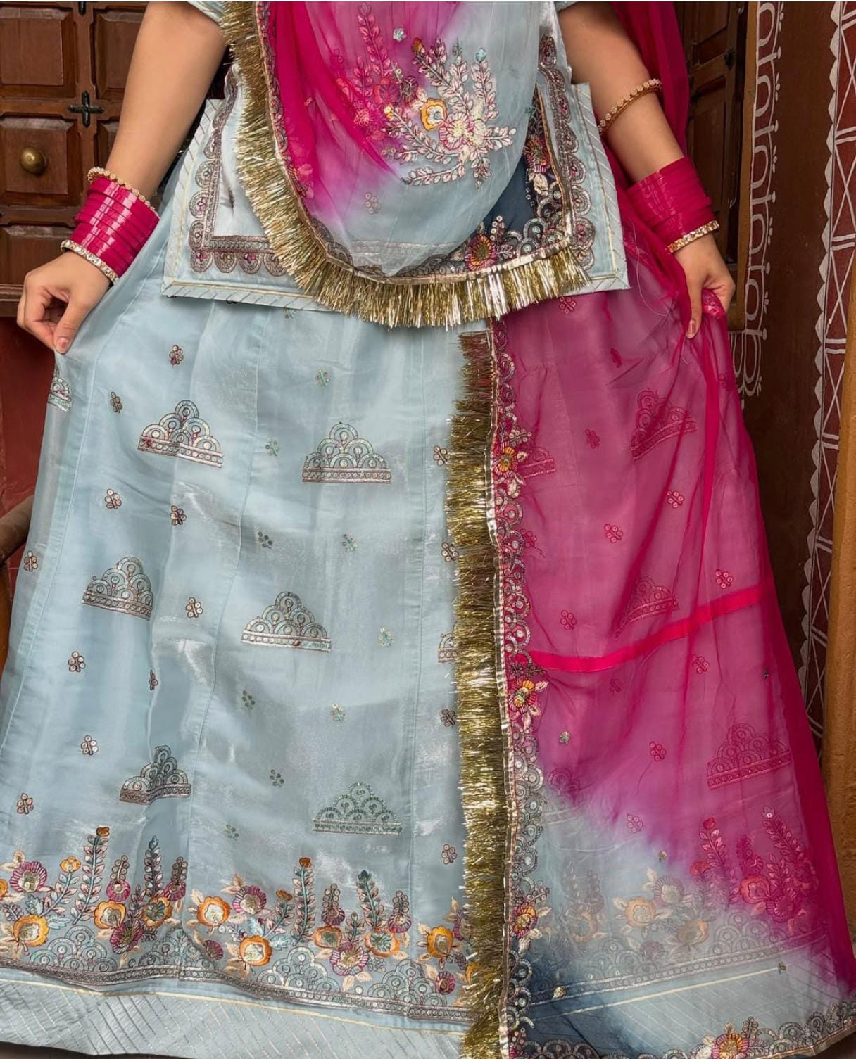 Step into royalty with this Elegant Partywear Rajputi Poshak, crafted in luxurious Heavy Fendy Tissue fabric for a premium festive look. The outfit is beautifully adorned with Heavy Sequence, Twill Zari & Resham Work, reflecting traditional craftsmanship with a touch of modern elegance.