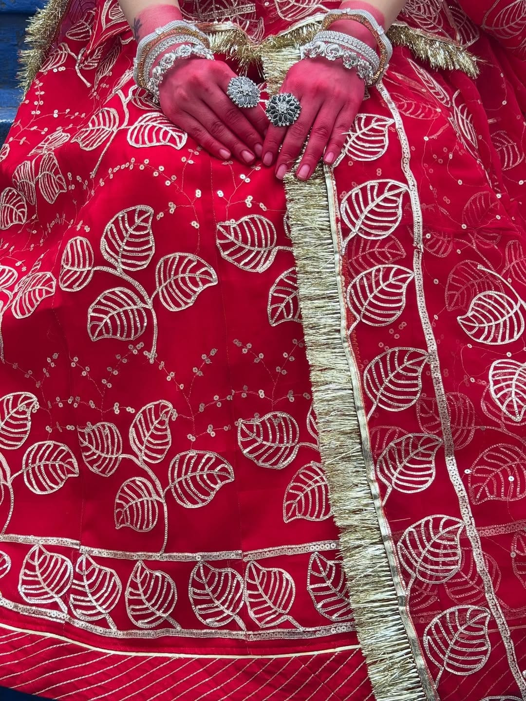 Wrap yourself in the timeless grace of Raktraag, A red ribbon suit crafted in luxurious hamrai fabric. Paired with a complementing hamrahi odhna, this ensemble exudes royal elegance with every detail. The deep red hue reflects passion and festivity, while the flowing drape ensures a regal charm perfect for weddings, occasions, and traditional gatherings. A masterpiece from Bindani, made for those who carry heritage with pride and beauty.