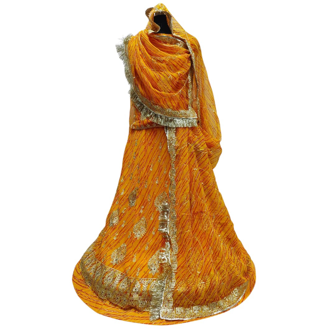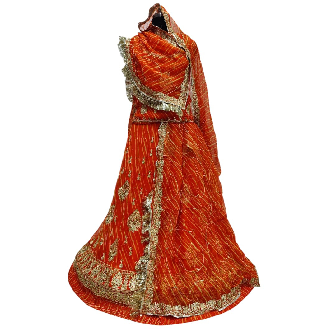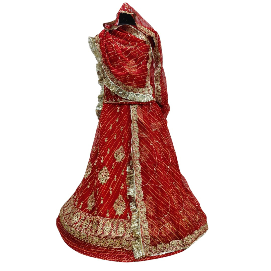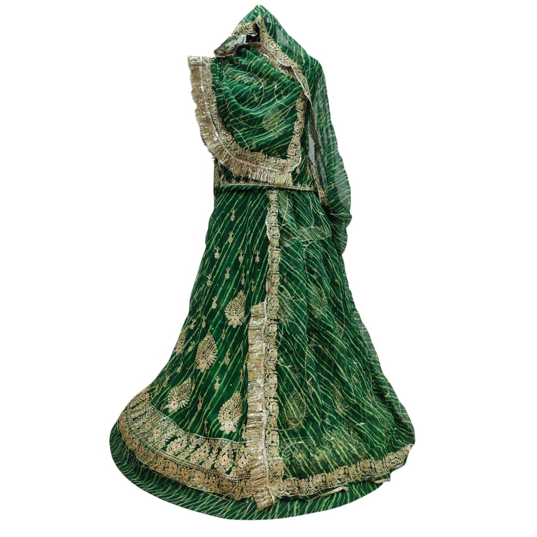 Step into royal elegance with this Leheriya Designer Rajputi Poshak, crafted from heavy-quality half pure fabric and adorned with intricate detailing. This traditional ensemble is a celebration of Rajasthani culture, perfect for festivals, weddings, and grand occasions.