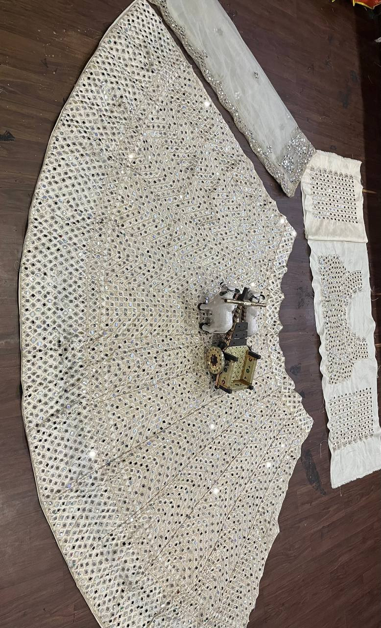 Unveil your royal charm with our Real Mirror Work Lehenga, crafted from premium Mono Satin Silk for an elegant shine and luxurious feel. Designed with heavy real mirror embroidery, this semi-stitched lehenga features a 3.5-meter grand flare, enhanced with Can-Can and Canvas Patta layers for perfect volume and comfort.
