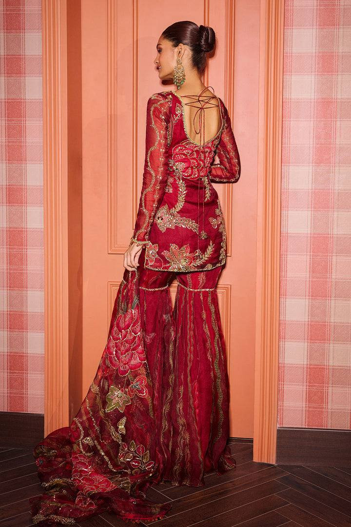 The beautifully fully stitched Tabby Silk top is paired with a digitally printed Tabby Silk palazzo, adding a modern touch to traditional elegance. Completing the look is a 2.3-meter Tabby Silk dupatta, adorned with matching hand sequins work for a graceful finish.