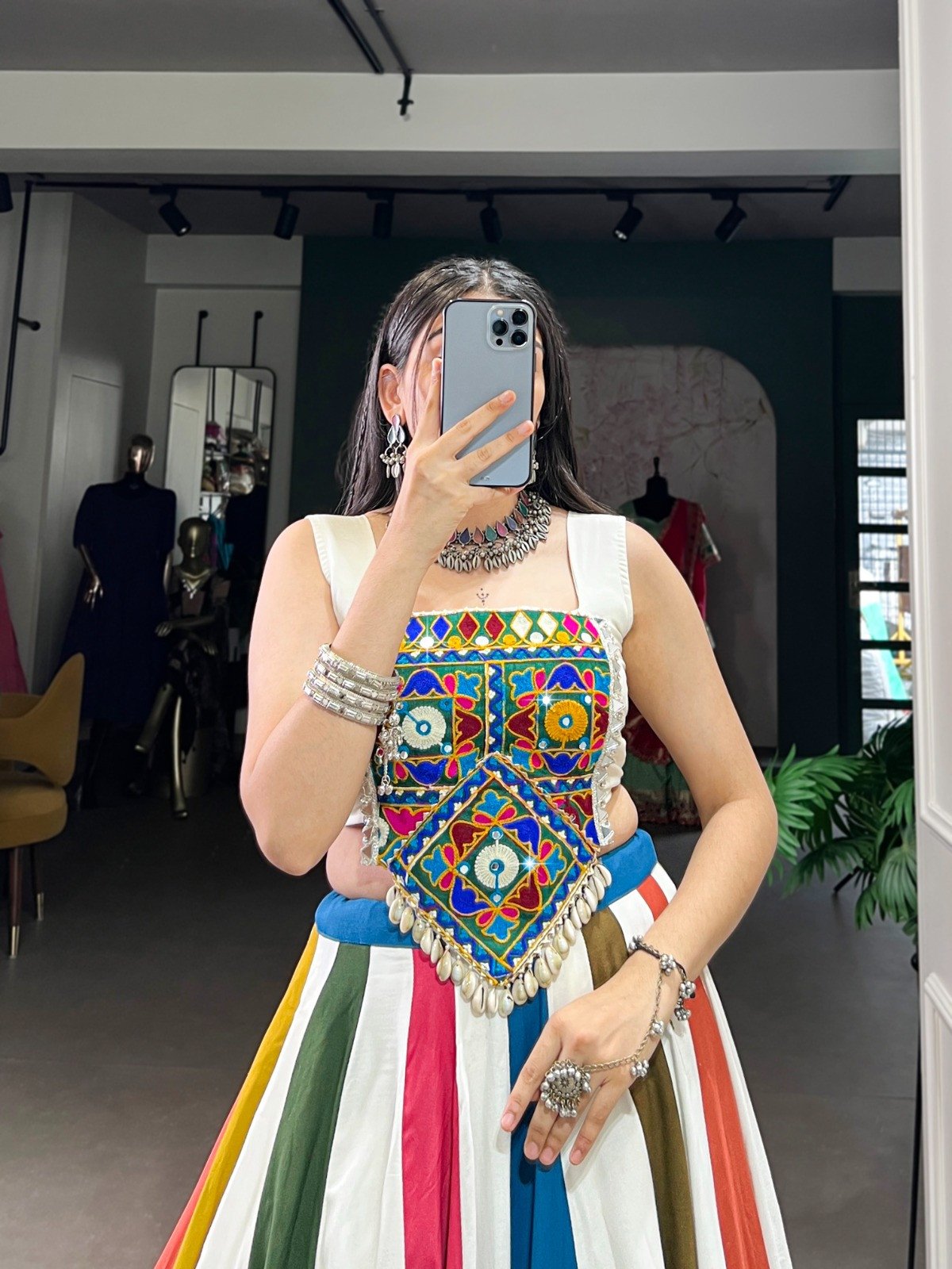 The highlight is the blouse, exquisitely embellished with original mirror Gamthi work, Gota Patti, Cowrie (Kodi) lace, and shimmering Jarkan diamond detailing—a true reflection of tradition meeting glam!
