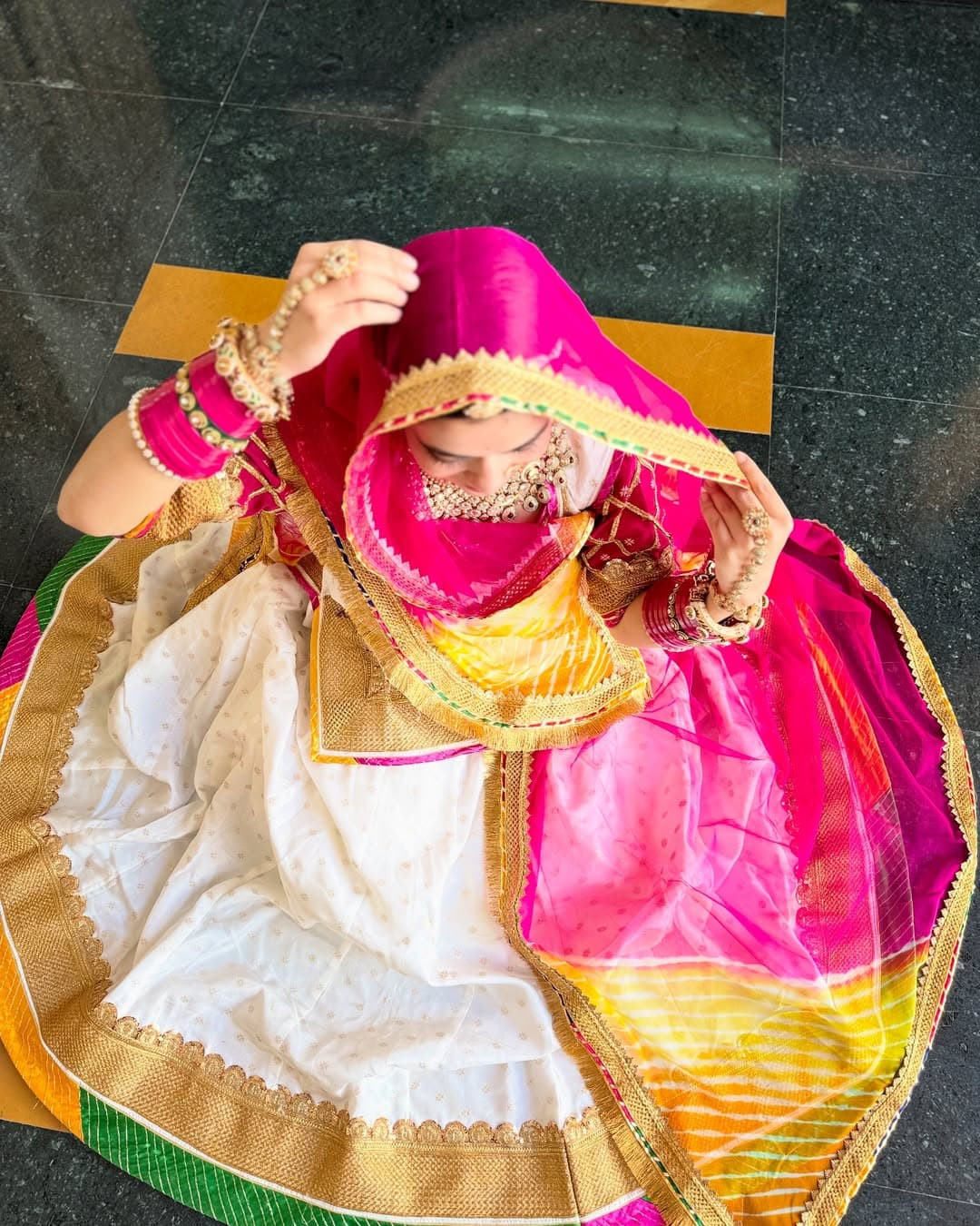 Embrace the royal charm of Rajasthan with this most demanded traditional poshak, crafted from high-quality Dola silk fabric and adorned with exquisite golden lafa handwork. The look is completed with a stunning multicolour pure odhana, adding a vibrant and festive touch to the outfit. Ideal for weddings, festivals, and cultural occasions, this poshak blends timeless elegance with handcrafted beauty.
