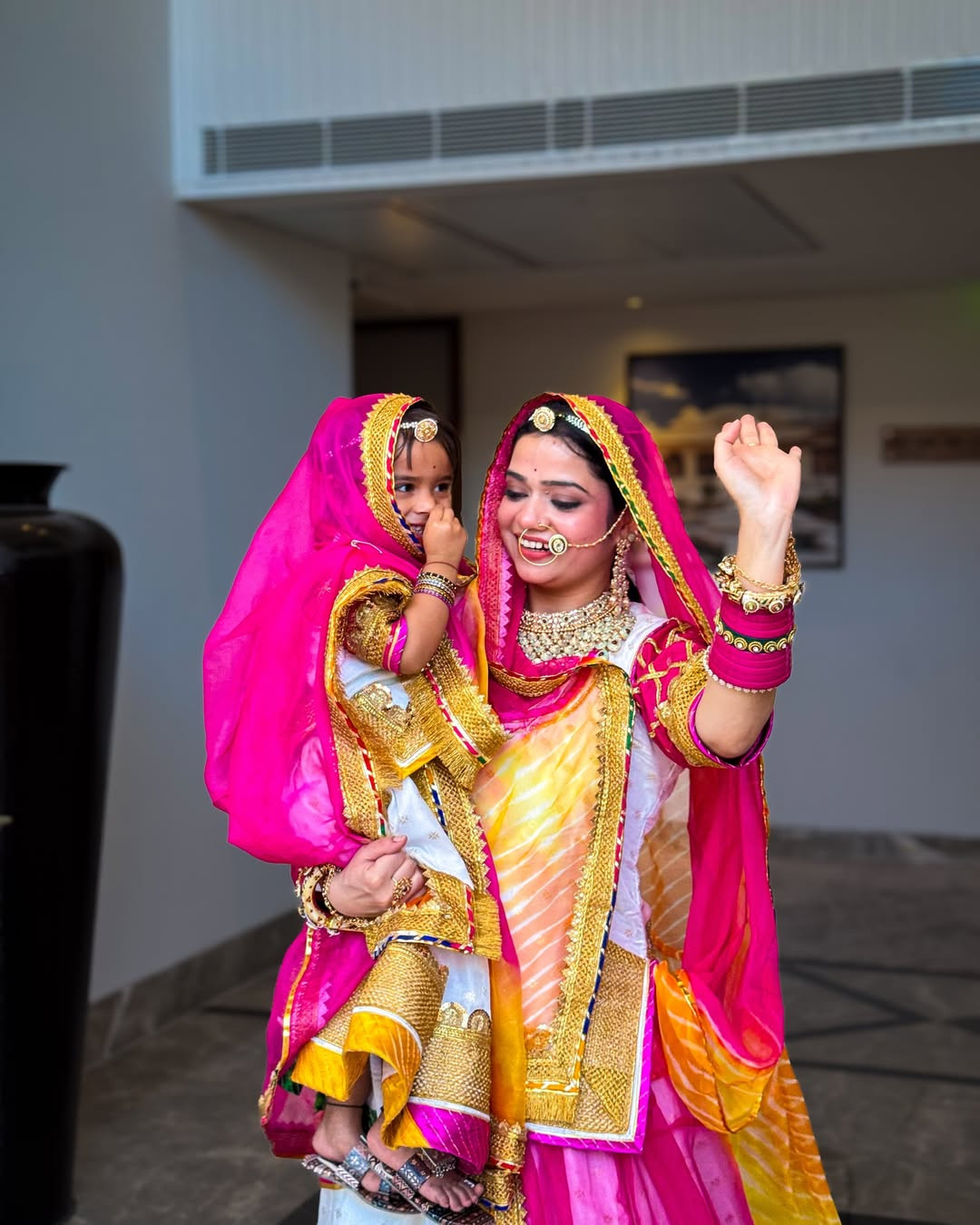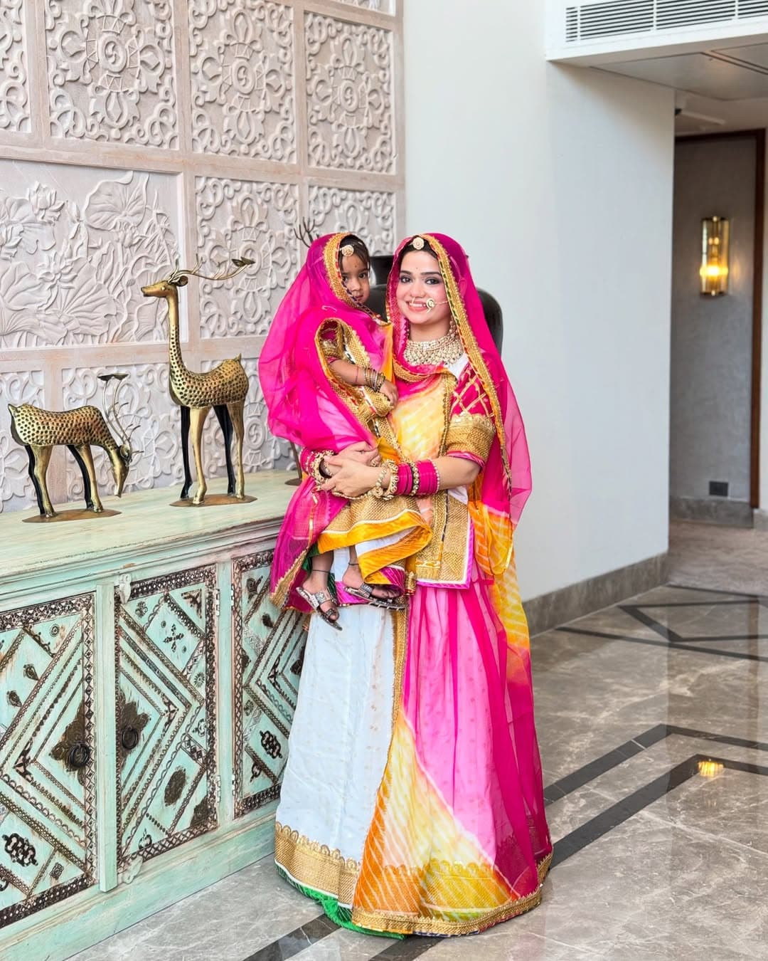 Celebrate tradition and togetherness with this beautifully crafted Mother-Daughter Rajasthani Poshak Combo. Made from luxurious Dola silk fabric, both outfits are adorned with elegant golden lafa handwork and paired with a vibrant multicolour pure odhana. Perfect for weddings, festivals, or family functions, this matching set creates a timeless and heartwarming look that reflects Rajasthani heritage and style.
