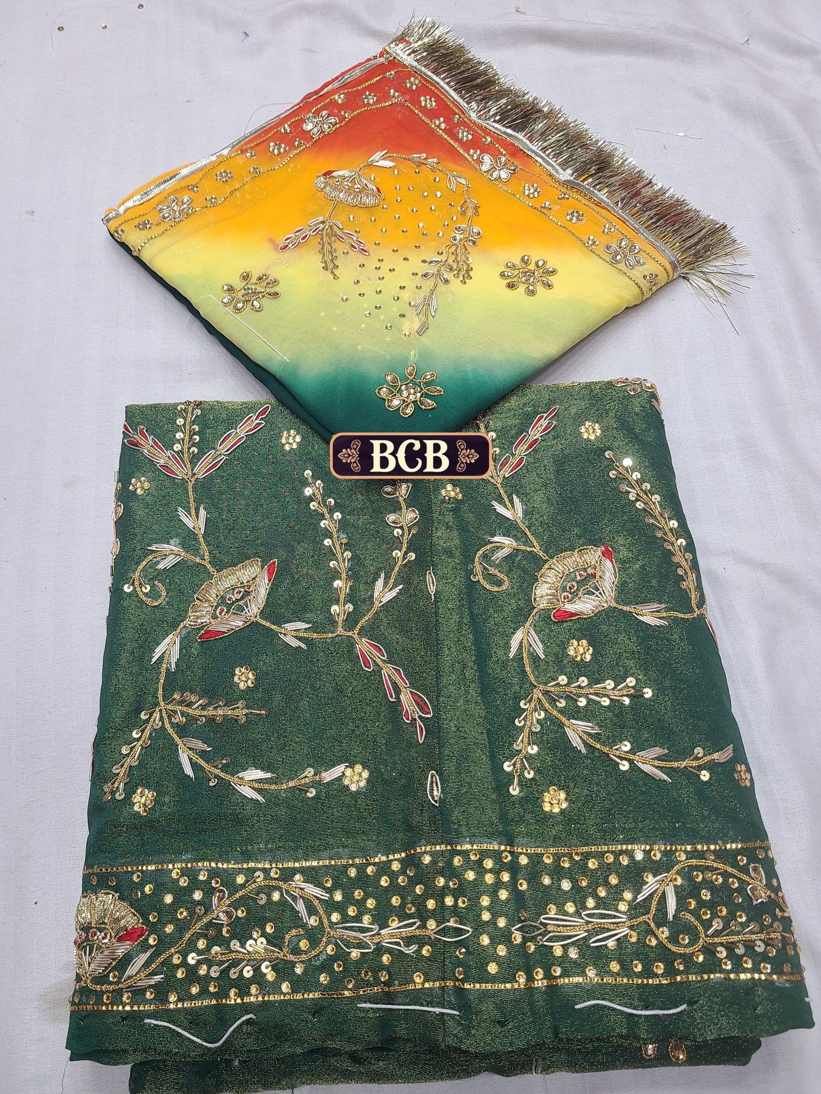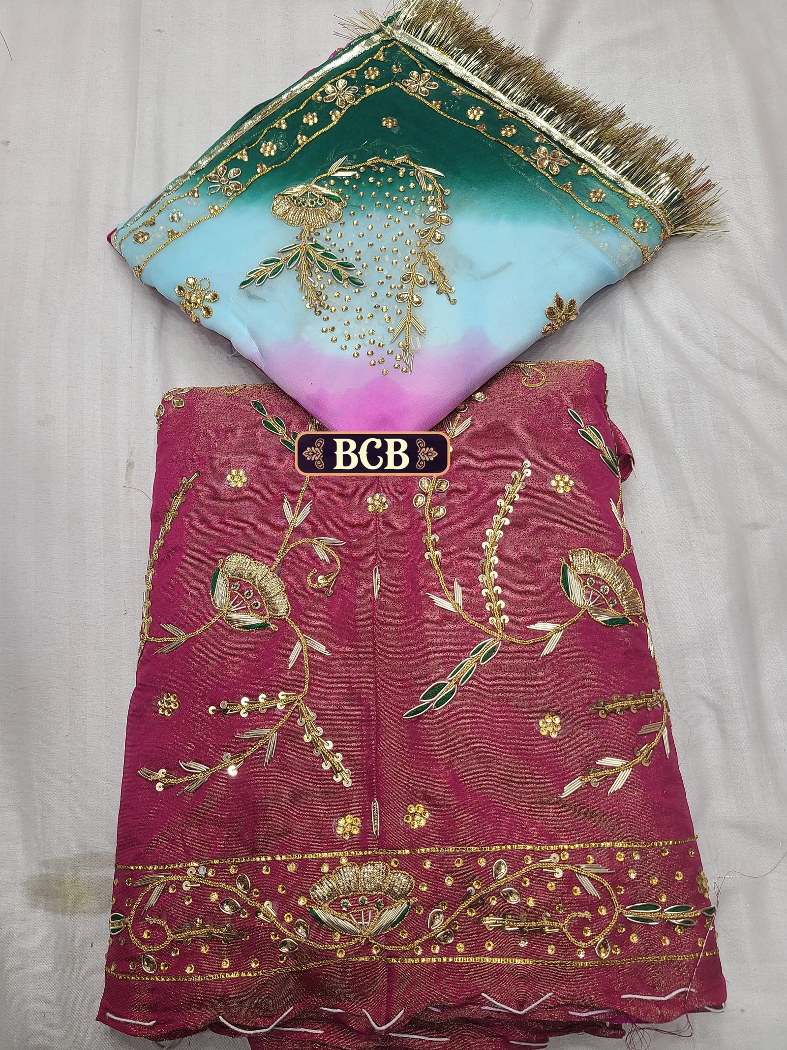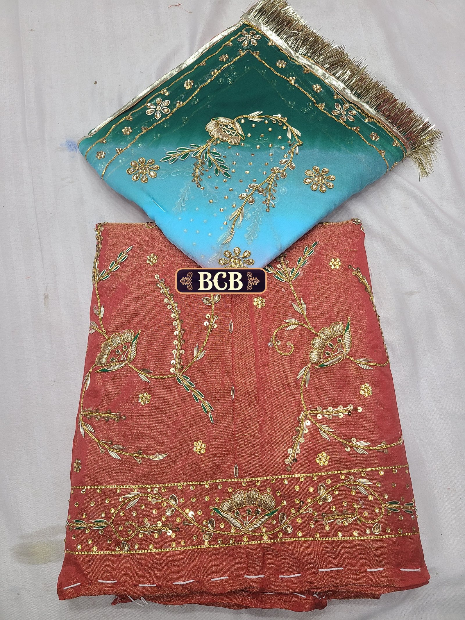 Delicately detailed with Aari, Mngji, Kiran, and Gota embellishments, every element of this poshak reflects timeless elegance and cultural heritage. Perfect for weddings, festive occasions, or heritage celebrations, this outfit promises to make you stand out with grace and grandeur.