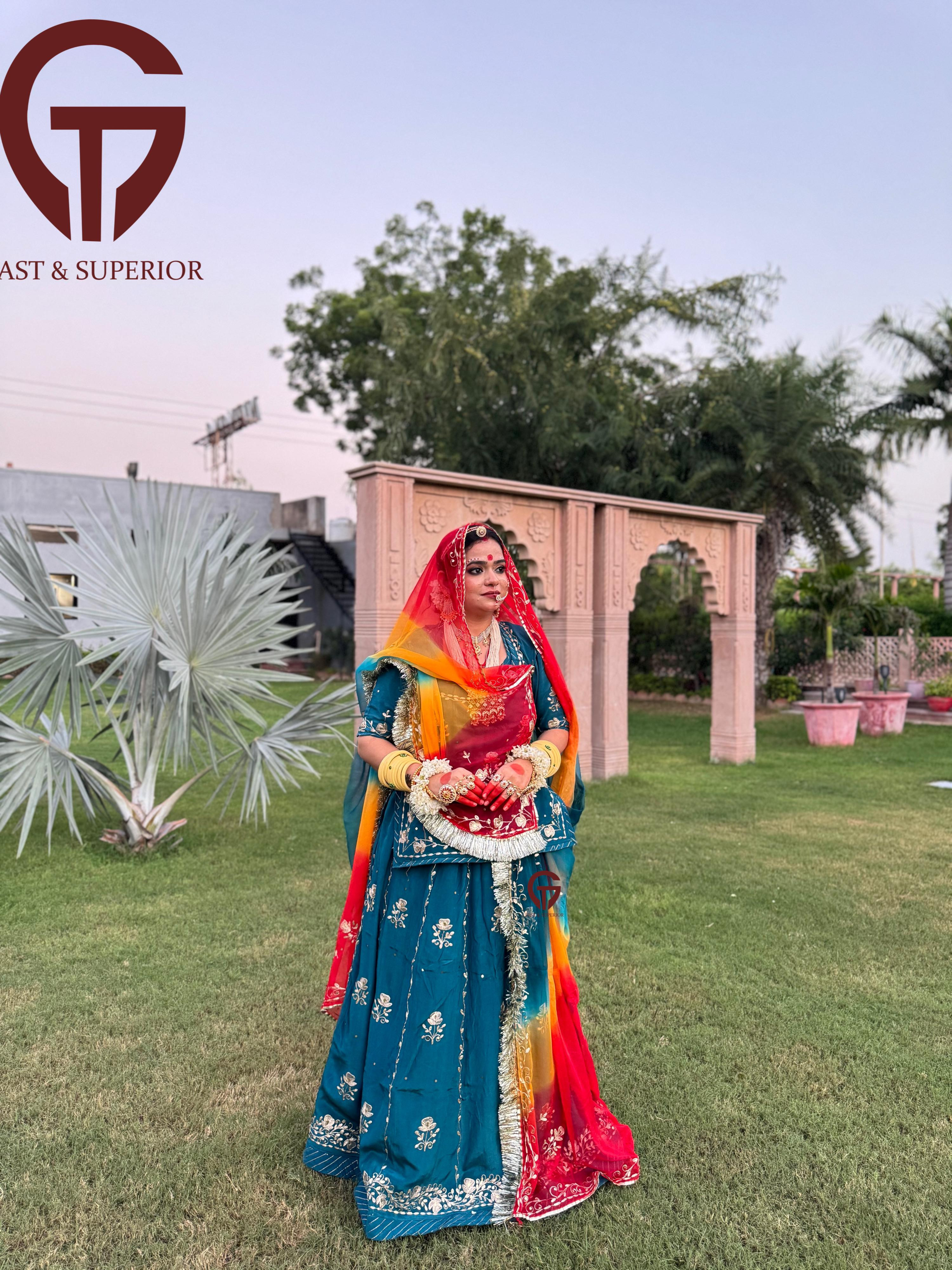 A Rajputi Poshak refers to the traditional attire worn by Rajput women, particularly in Rajasthan and parts of North India. It is a rich and elaborate outfit that reflects the royal heritage, culture, and elegance of the Rajput community. The attire is characterized by its vibrant colors, luxurious fabrics, intricate embroidery, and regal style.