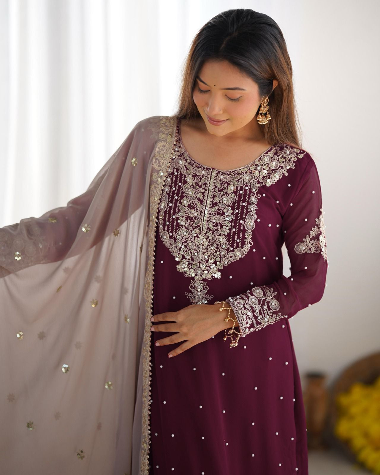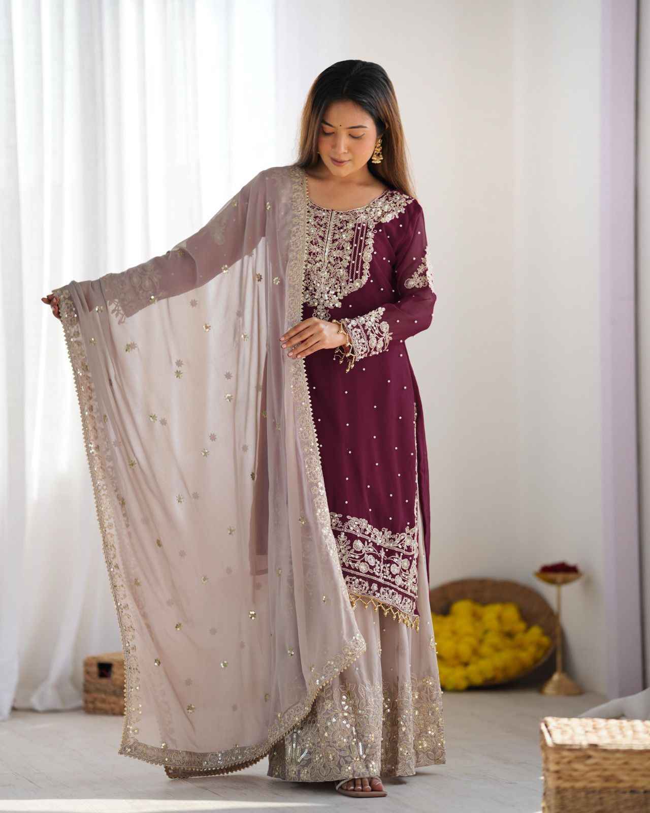 Plazzo Fabrics- :Heavy Faux Georgette With Heavy Embroidery Coding Dori-Sequence Work And Rivet Miti Work With Elastic
