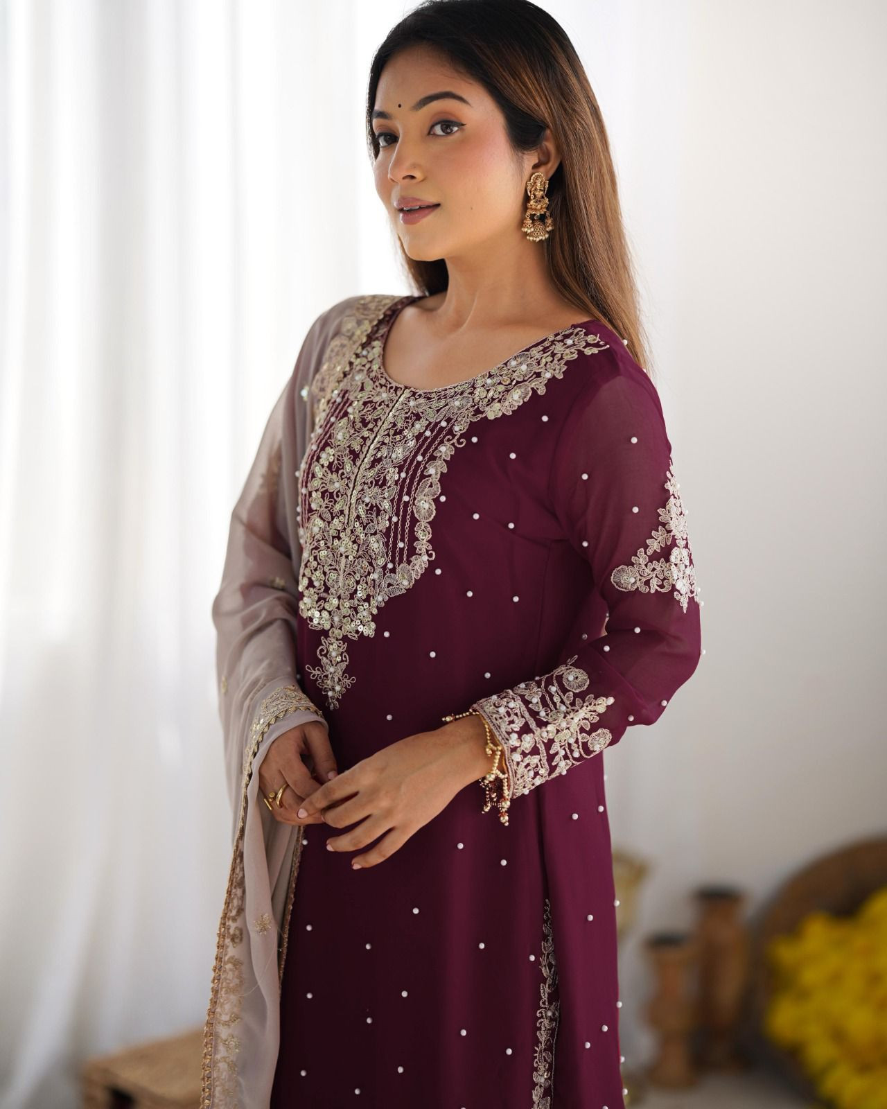 Top Fabric : Heavy Faux Georgette With Heavy Embroidery Coding Dori-Sequence Work With Rivet Moti Work Full Sleeve