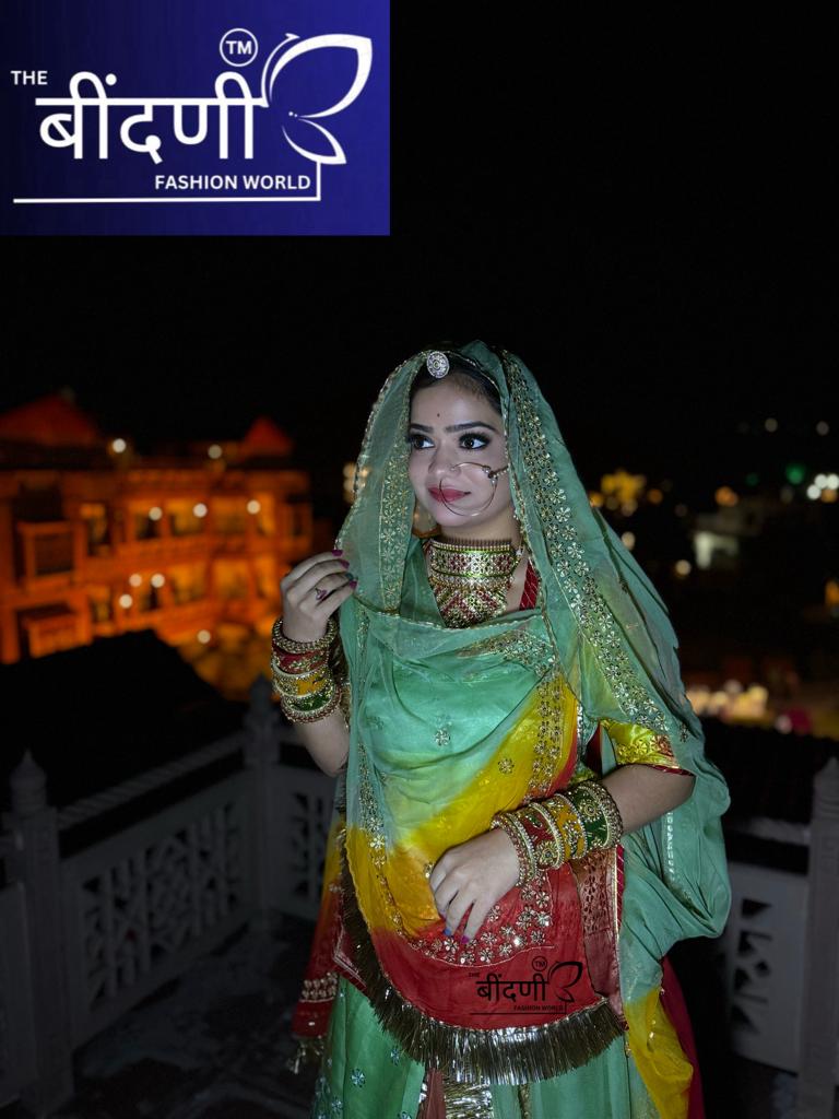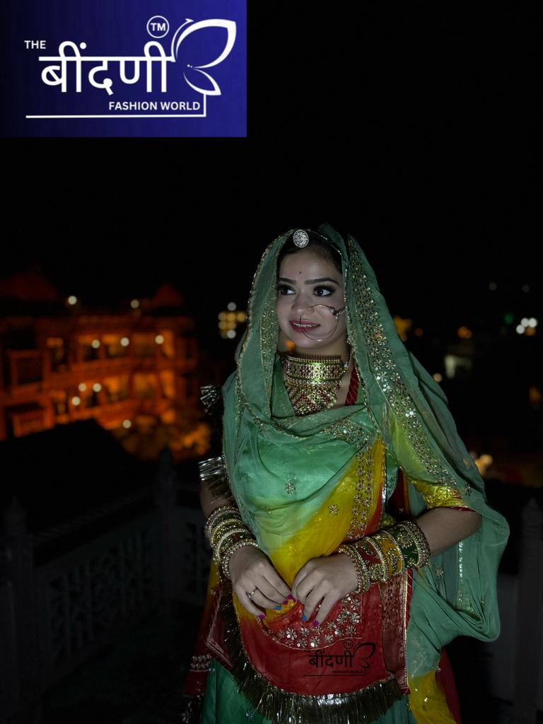 Opulent Elegance: Organza Three-Tone Poshak with Zari and Sequin Embellishments(Semi stich)