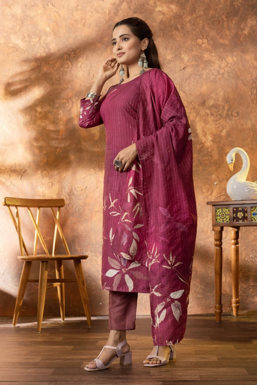 The set includes a lined top, matching bottom, and dupatta, making it a complete and ready-to-wear choice for effortless style. Experience the perfect blend of tradition and modern charm.